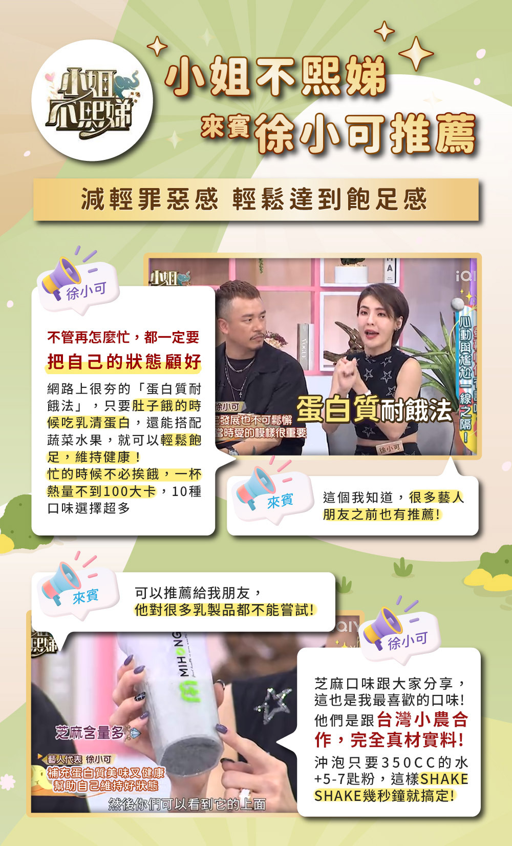 金萱奶綠(清淡版):即溶乳清蛋白(濃縮乳清蛋白、分離乳清蛋白、大豆卵磷脂)、全脂奶粉、金萱烏龍茶粉、玉米來源可溶性纖維、關華豆膠、二氧化矽