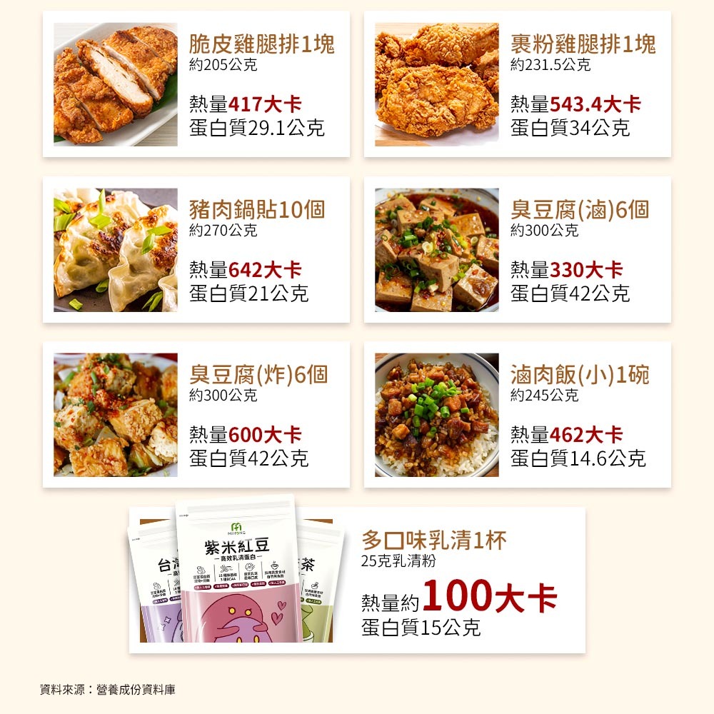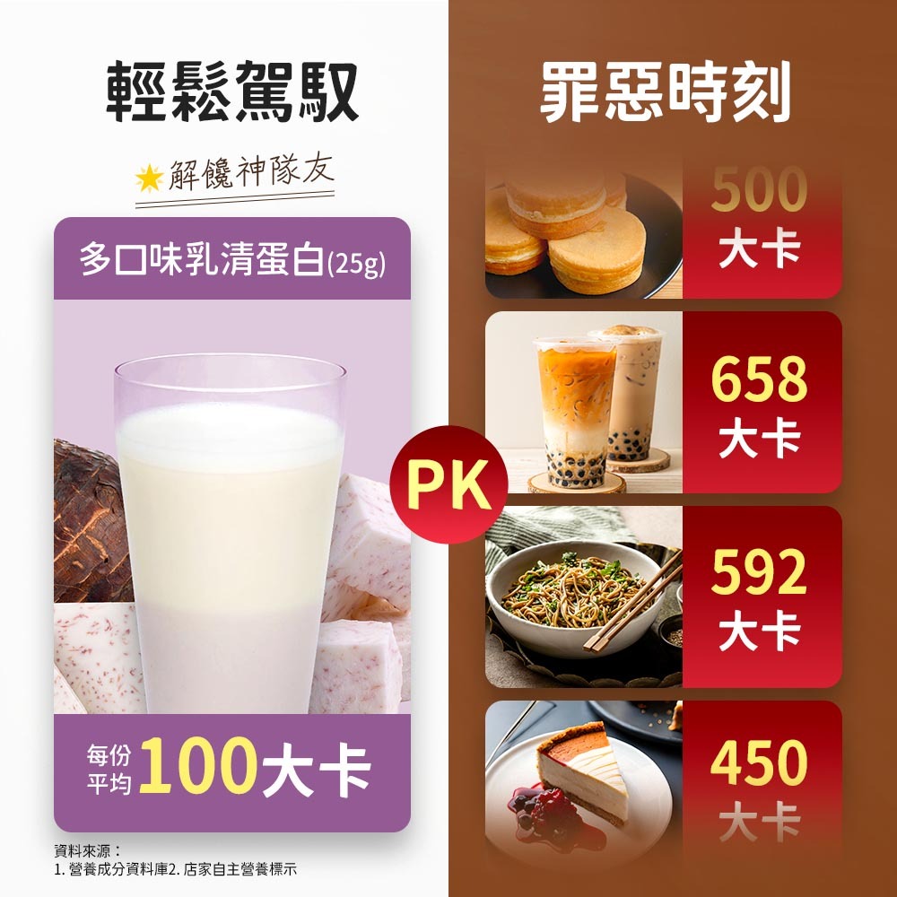 紫米紅豆:乳清蛋白(濃縮乳清蛋白、分離乳清蛋白、卵磷脂)、紅豆粉、紫米粉、關華豆膠、二氧化矽、甜味劑(醋磺內酯鉀、蔗糖素)