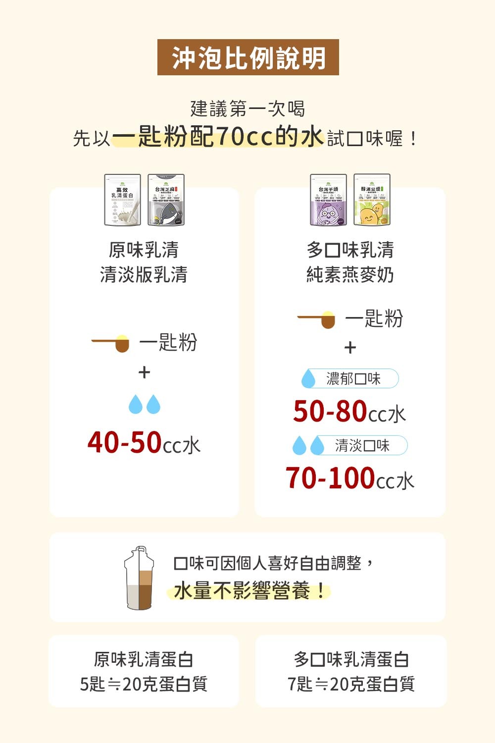食用方式:第一次飲用,建議1持配70c.c.的水量試口味,喜愛一般口味建議1匙配70~100c.c.的水量, 喜愛濃郁口味建議1匙配50~80c.c.的水量, 水量不影響營養。
