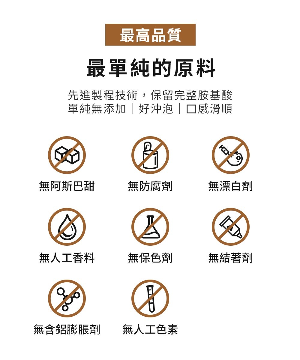 香醇牛奶:乳清蛋白(濃縮乳清蛋白、分離乳清蛋白、卵磷脂)、全脂奶粉、關華豆膠、二氧化矽、甜味劑(醋磺內酯鉀、蔗糖素)