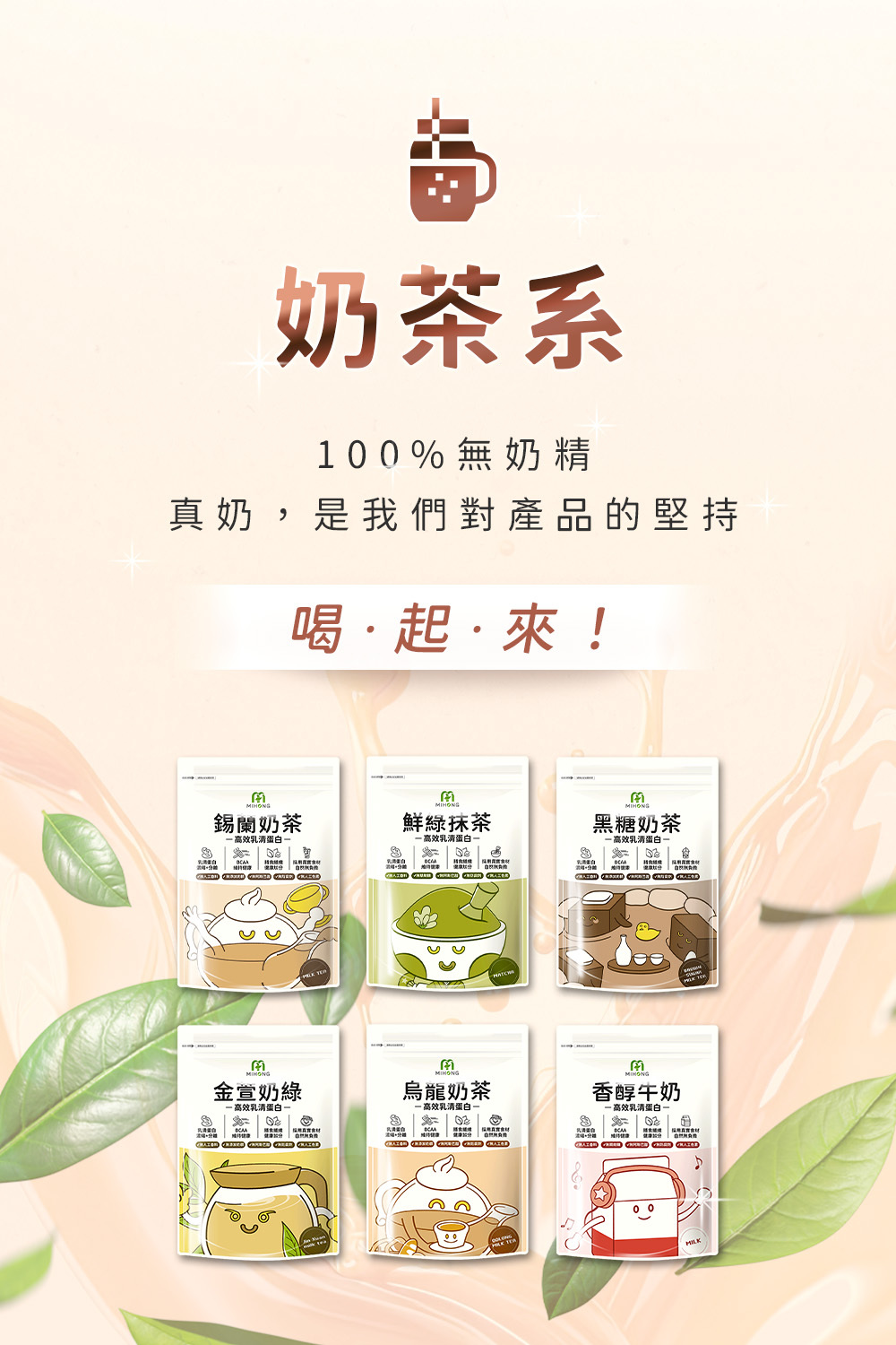 金萱奶綠:即溶乳清蛋白(濃縮乳清蛋白、分離乳清蛋白、卵磷脂)、全脂奶粉、金萱烏龍茶粉、玉米來源可溶性纖維、關華豆膠、二氧化矽、甜味劑(醋磺內酯鉀、蔗糖素)