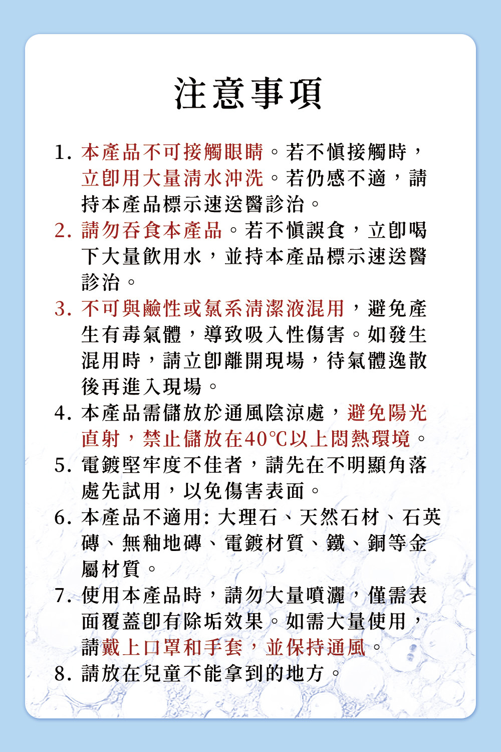 7. 使用本產品時,請勿大量噴灑,僅需表面覆蓋即有除垢效果。如需大量使用,請戴上口罩和手套,並保持通風。