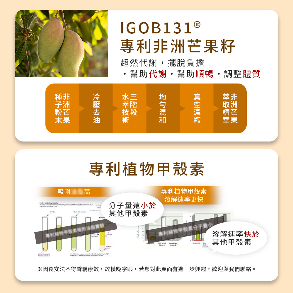 商品成份:非洲芒果種子萃取物、白腎豆萃取物、幾丁聚糖、維生素B群(麥芽糊精、乳糖、核黃素、維生素B6(鹽酸吡哆辛)、菸鹼醯胺、維生素B1(硝酸硫胺明)、維生素B12(麥芽糊精、檸檬酸鈉、檸檬酸、維生素B12)、本多酸鈣、葉酸、生物素)、VF136綜合蔬果發發酵物(諾麗果、哈蜜瓜、茄子、苦瓜、冬瓜、紅蘿蔔、南瓜、馬鈴薯、胡瓜、絲瓜、小黃瓜、秋葵、青花椰菜、地瓜葉、地瓜、空心菜、芹菜、西洋芹、茭白筍、玉米、大白菜、菠菜、芥藍、小白菜、青江菜、黑豆、菜豆、敏豆、莧菜、黃豆芽、高麗菜、牛蒡、山藥、老薑、甜椒、青椒、紅鳳菜、A菜、巴西栗、檸檬、鳳梨、葡萄、番茄、青木瓜、梅子、蘋果、柚子、葡萄柚、柳丁、碰柑、甜橙、百香果、番石榴、棗子、紅棗、甜菜根、桑椹、李子、紅龍果、荔枝、龍眼、桃子、蓮霧、香菇、金針菇、黑木耳、草莓、藍莓、芒果、水蜜桃、青蘋果、蔓越莓、西印度櫻桃、水梨、白葡萄、康科特葡萄、山竹、枸杞、山桑子、黑醋栗、野櫻桃、酸櫻桃、余甘子、石榴、接骨木果、覆盆子(紅)、覆盆子(黑)、螺旋藻、綠藻、蕁麻、小麥草、大麥草、猴頭菇、迷你胡蘿蔔、香芹、羽衣甘藍、靈芝、舞茸、椎茸、巴西蘑菇、花椰菜芽、義大利鑽石花椰菜、羽衣甘藍菜芽、花椰菜、紅甘藍菜、紫甘藍菜、球花甘藍、澱粉酵素、木瓜酵素、蛋白酵素、脂肪酵素、橘子、木瓜、香蕉、萊姆、黃瓜、洋梨、荷蘭芹、萵苣、羅勒、玉米鬚、九層塔、大麥苗粉、小麥苗粉、小米草萃取物、小米萃取物、山楂果、西洋參、當歸、熟地、白芍、川芎、人蔘、桂圓、黑棗、奇異果)、綜合蔬果萃取物(鳳梨萃取物、糖化發酵物、脂肪發酵物、纖維發酵物、青木瓜萃取物)、蘋果纖維萃取物、蒟蒻精粉、麥芽糊精、余甘子萃取物、啤酒酵母粉、玉米來源可溶性纖維、栗子皮萃取物、山楂果萃取物、枸杞萃取粉、二氧化矽、鉻酵母。