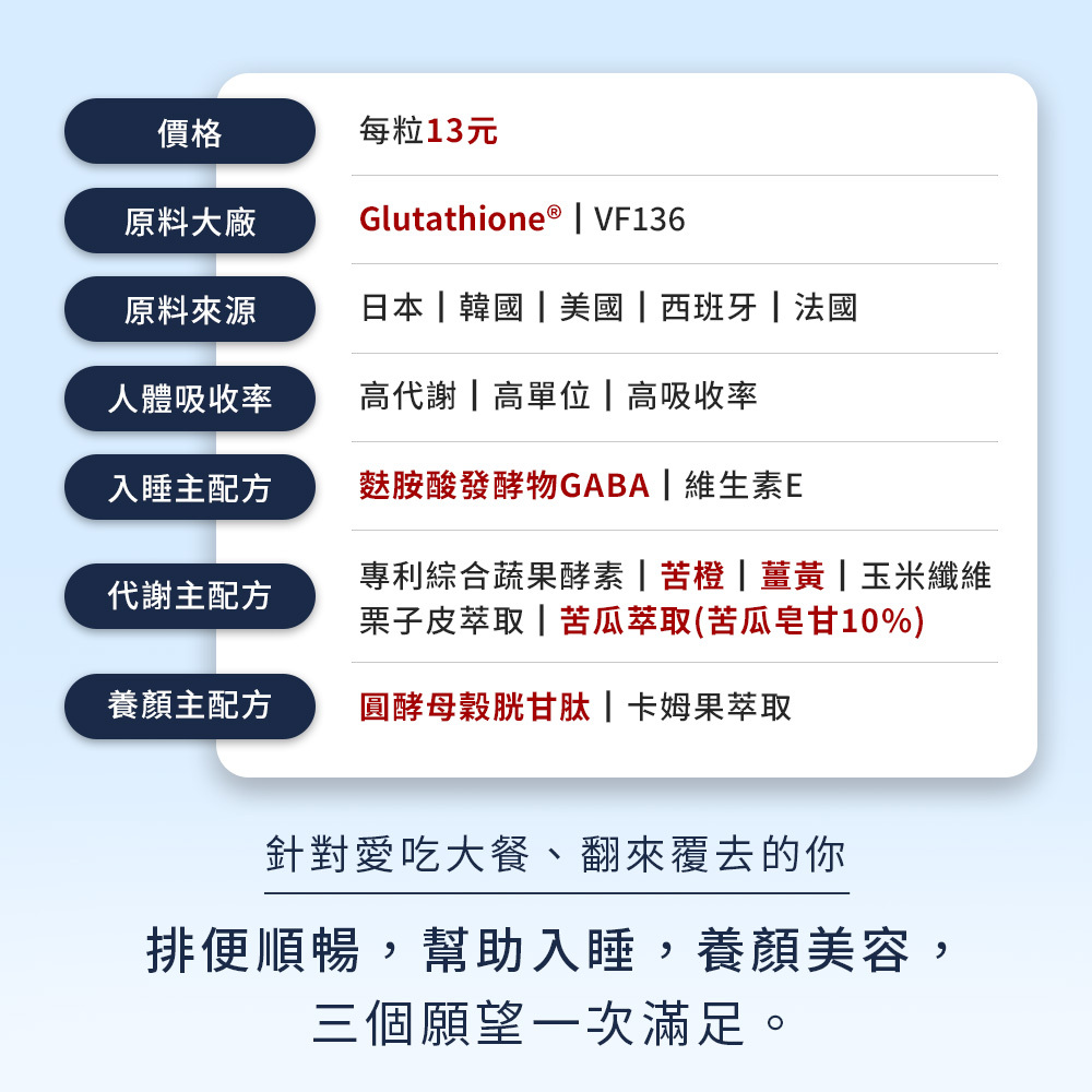 A.:以專利136種蔬果精華酵素為基底,再添加夜晚所需的草本代謝,在漫長的夜晚裡幫助你⭐️幫助入睡⭐️幫助代謝⭐️養顏美容。
