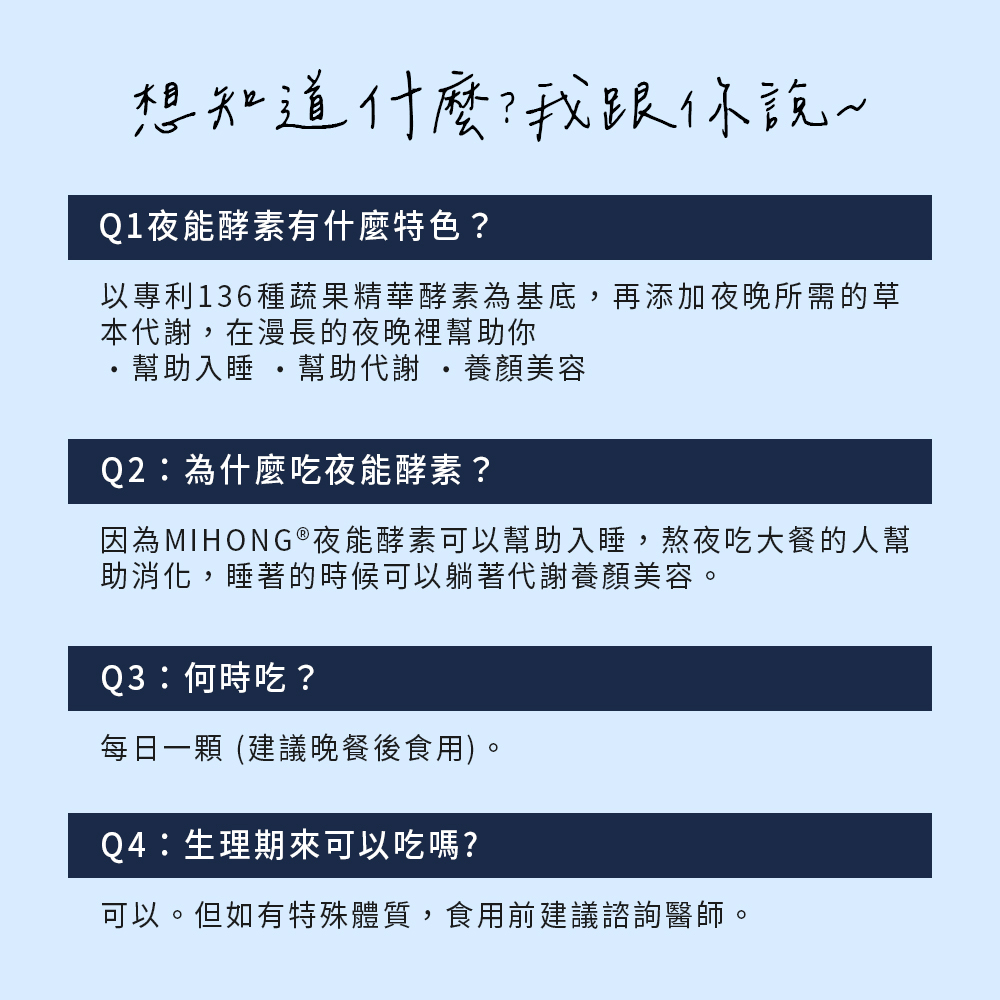 A:因為MIHONG®夜能酵素可以幫助入睡,熬夜吃大餐的人幫助消化,睡著的時候可以躺著代謝養顏美容。