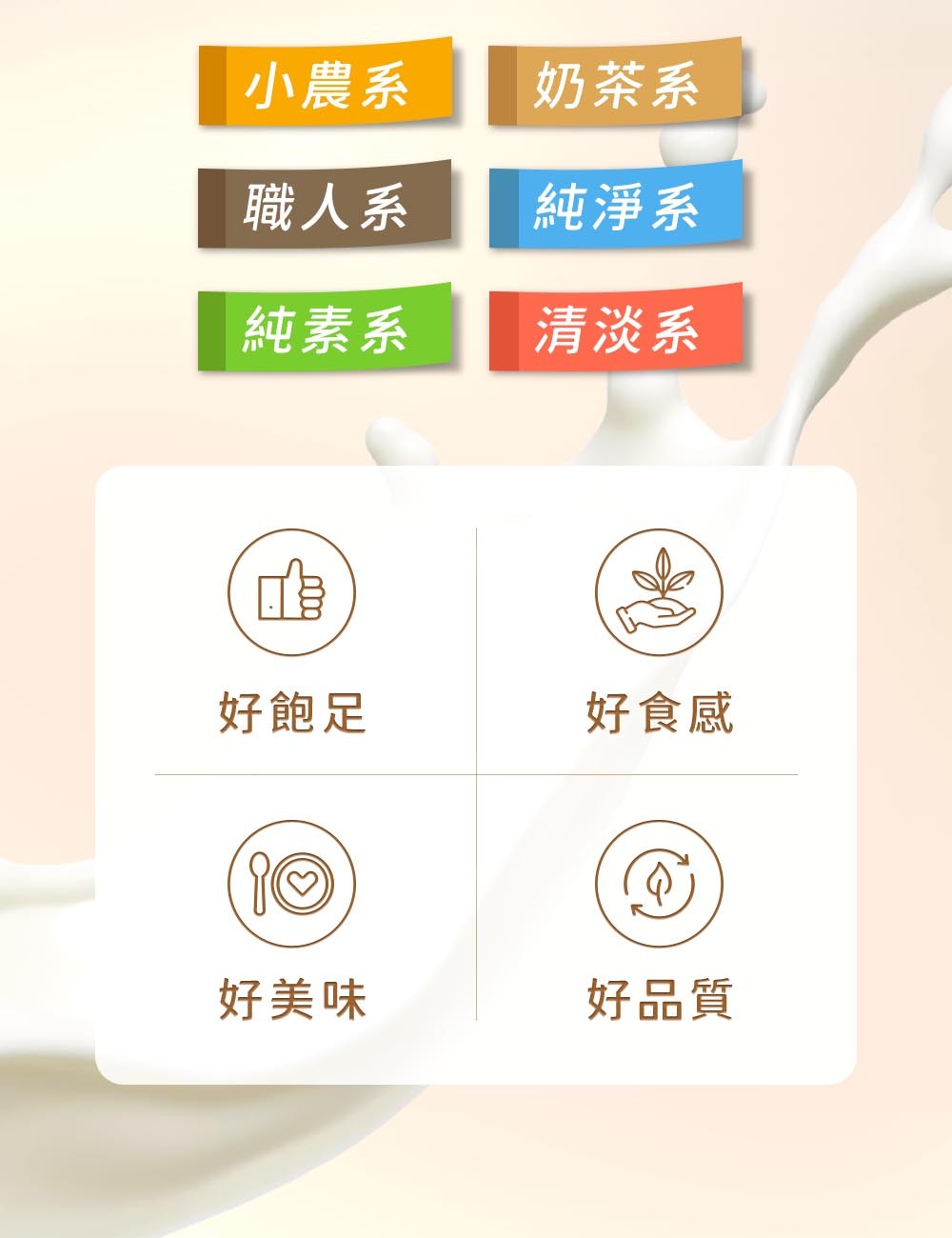 🌿高效燕麥奶-醇濃豆漿: 濃郁高級燕麥奶與馥郁的研磨黃豆,給清淡口味又不喜豌豆特殊味道的您最貼心的選擇,純淨的味道絕對會讓您一喝再喝!