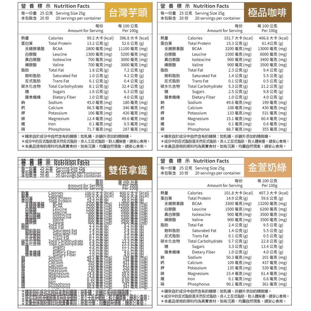 黑糖奶茶:乳清蛋白(濃縮乳清蛋白、分離乳清蛋白、卵磷脂)、黑糖粉、全脂奶粉、紅茶粉、關華豆膠、鹽、二氧化矽、甜味劑(醋磺內酯鉀、蔗糖素)