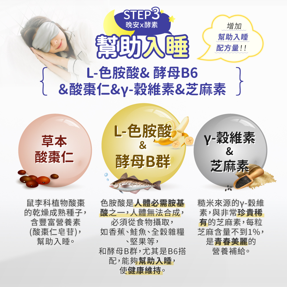 1.幫助入睡大升級 ! 加入L-色胺酸& 酵母B群調整體質