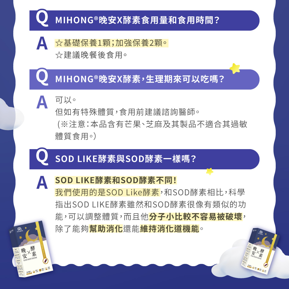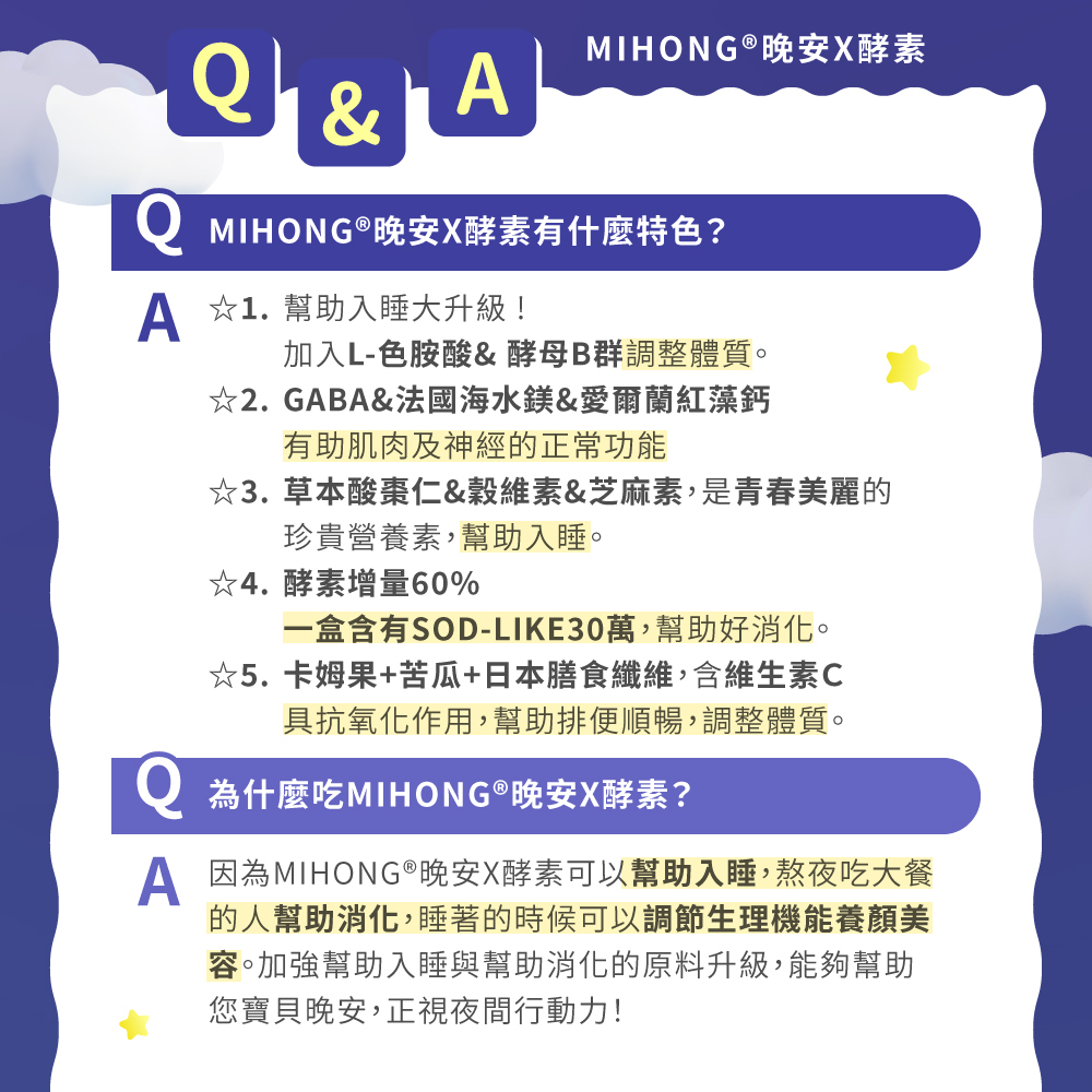 A:因為MIHONG®晚安X酵素可以幫助入睡,熬夜吃大餐的人幫助消化,睡著的時候可以調節生理機能養顏美容。加強幫助入睡與幫助消化的原料升級,能夠幫助您,寶貝晚安,正視夜間行動力!