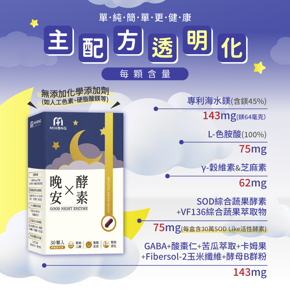 🌙MIHONG®晚安X酵素,全面升級!幫助晚安原料再升級,承襲草本濃縮精華基底,酵素增量60%,有酵SOD-Like30萬活酵素幫助消化,法國專利海水鎂,有助神經的正常功能,色胺酸與維生素B6相輔助搭配酸棗仁幫助入睡,VF136專利蔬果,幫助消化,特別添加卡姆果(維生素C)具抗氧化作用,養顏美容。正視夜間行動力,幫助維持健康。晚安酵素讓身體健康維持:幫助消化→調整體質→幫助入睡→促進代謝→養顏美容,告訴自己馬上行動起來。
