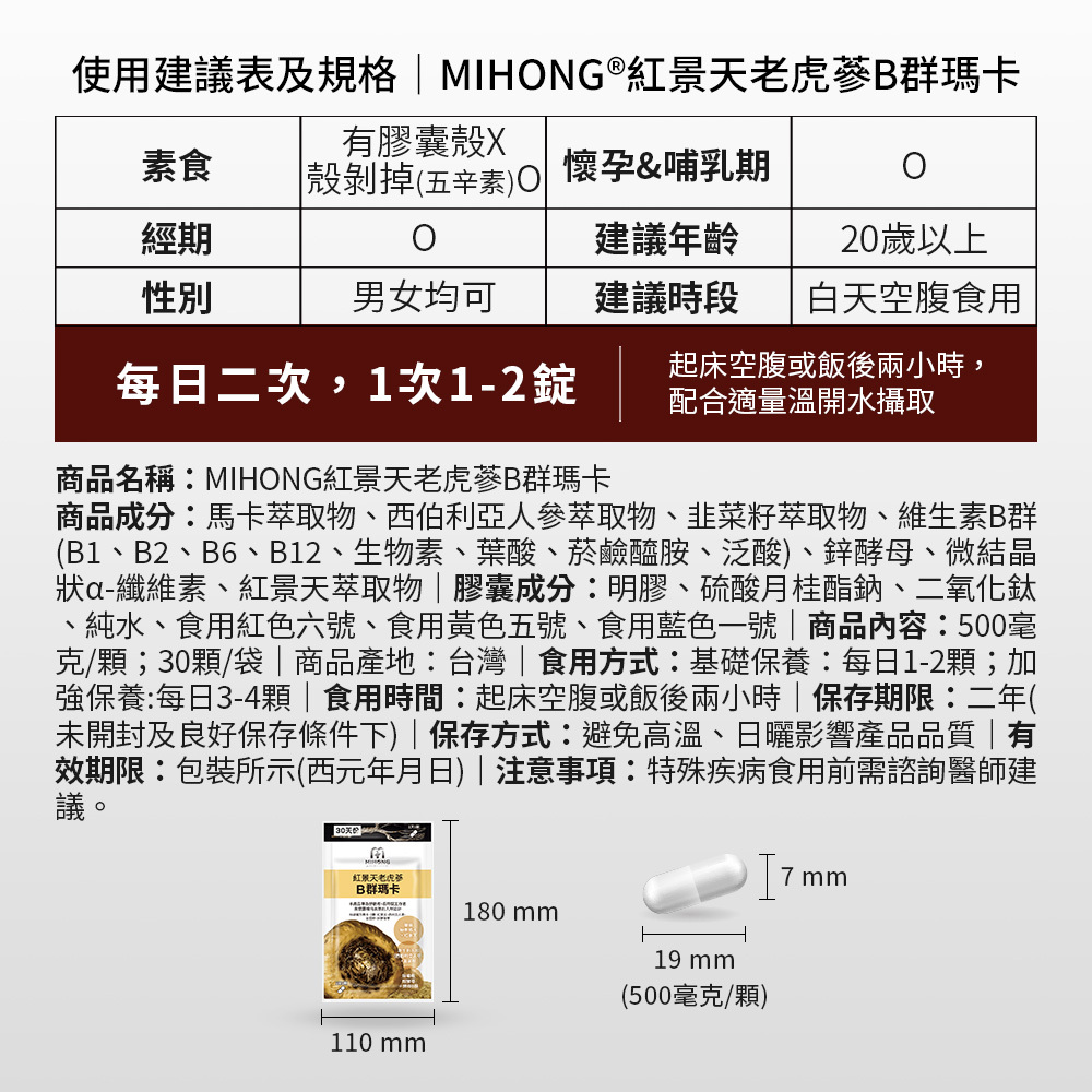 MIHONG®紅景天老虎蔘B群瑪卡(30顆/袋)