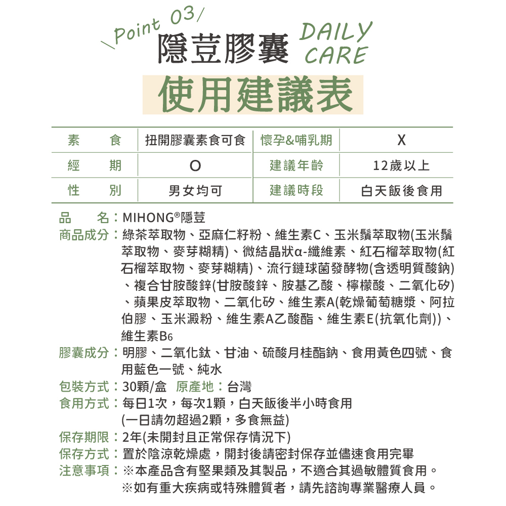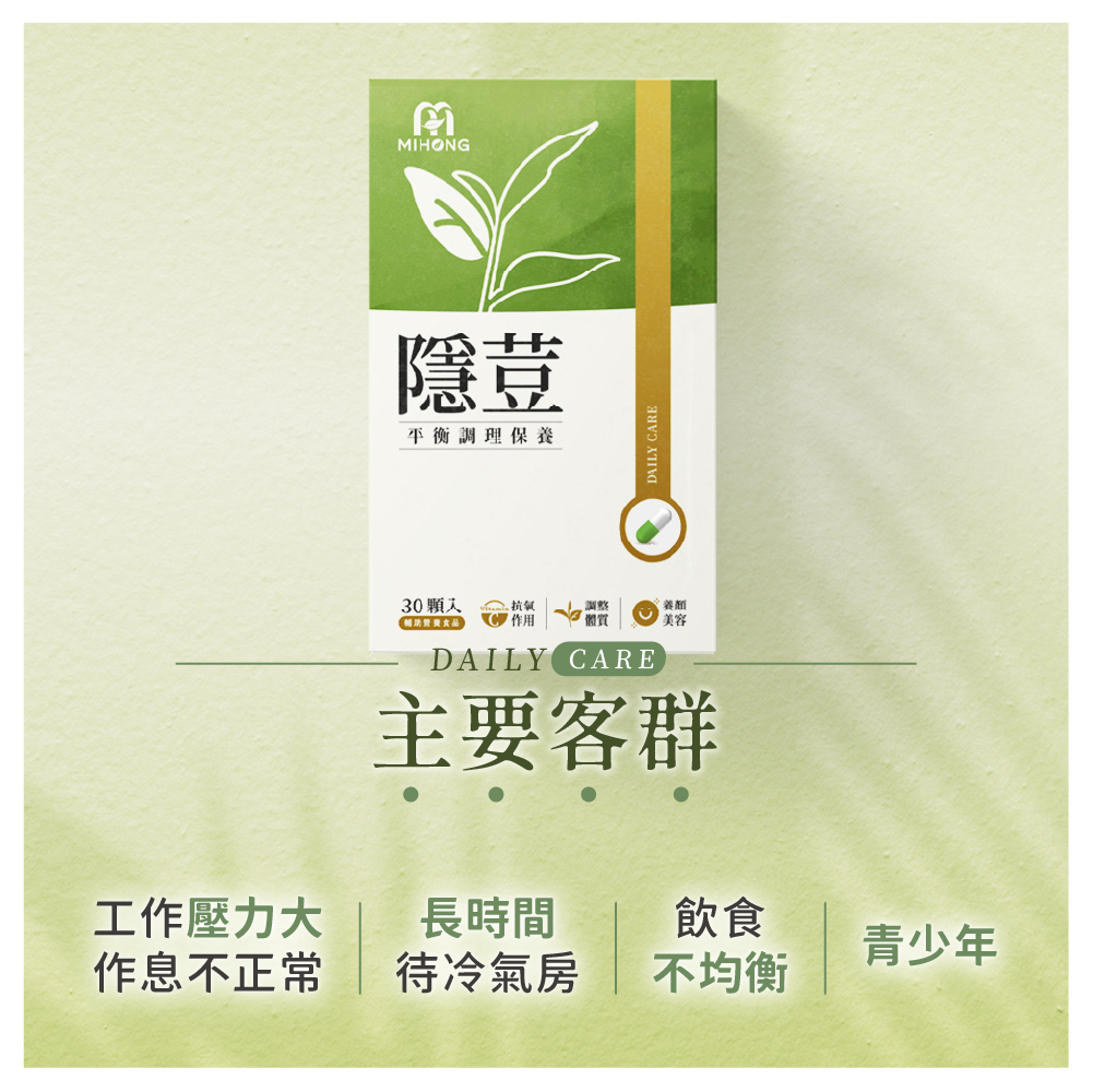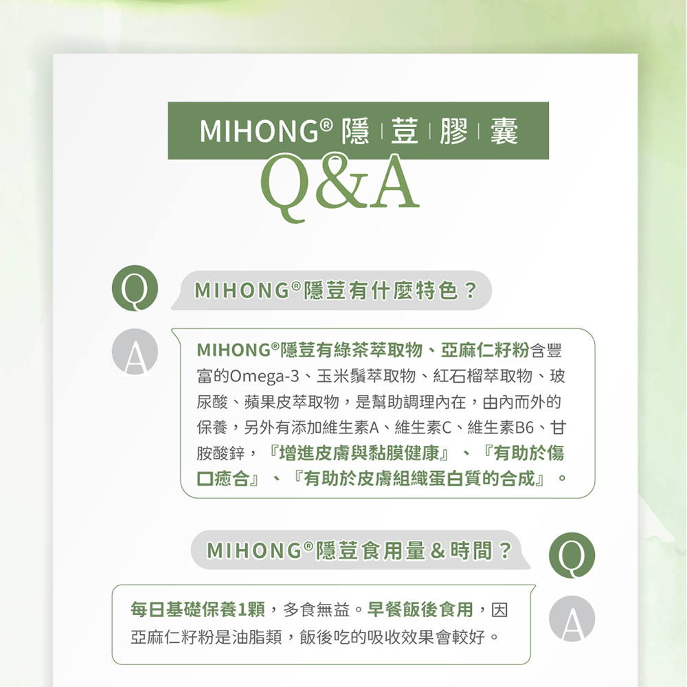 A:MIHONG®隱荳有綠茶萃取物、亞麻仁籽粉含豐富的Omega-3、玉米鬚萃取物、紅石榴萃取物、玻尿酸、蘋果皮萃取物,是幫助調理內在,由內而外的保養,另外有添加維生素A及甘胺酸鋅可增進皮膚與黏膜健康、維生素C有助於傷口癒合、維生素B6 維持胺基酸正常代謝。