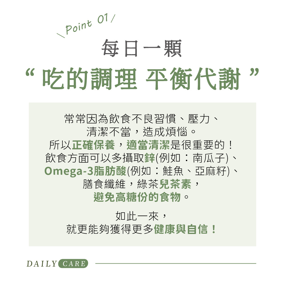 透過吃的調理,『幫助平衡代謝與調整體質』,特別添加維生素A、維生素C、維生素B6、甘胺酸鋅,『增進皮膚與黏膜健康』、『有助於傷口癒合』、『有助於皮膚組織蛋白質的合成』。