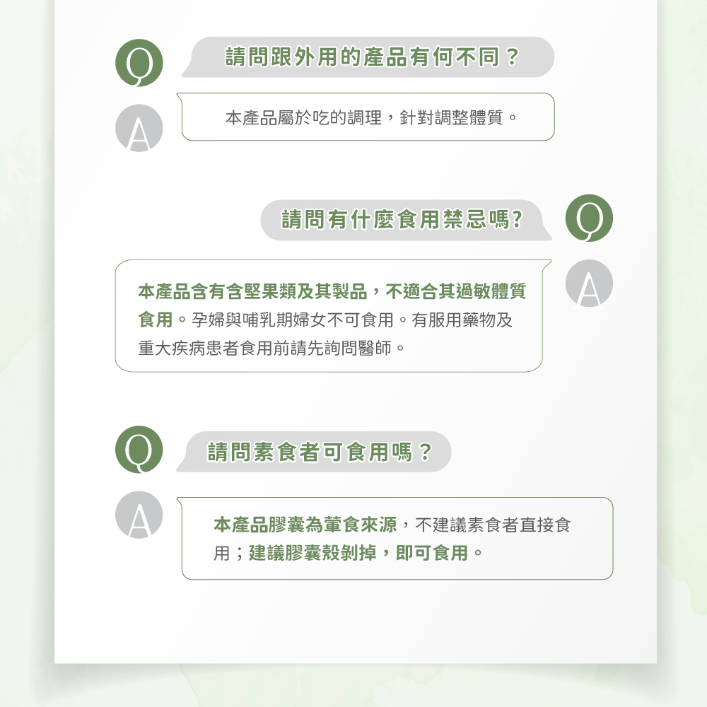 A:早餐飯後食用,因含有亞麻仁籽粉是油脂類,飯後吃的吸收效果會較好。Q:請問跟外用的產品有何不同?