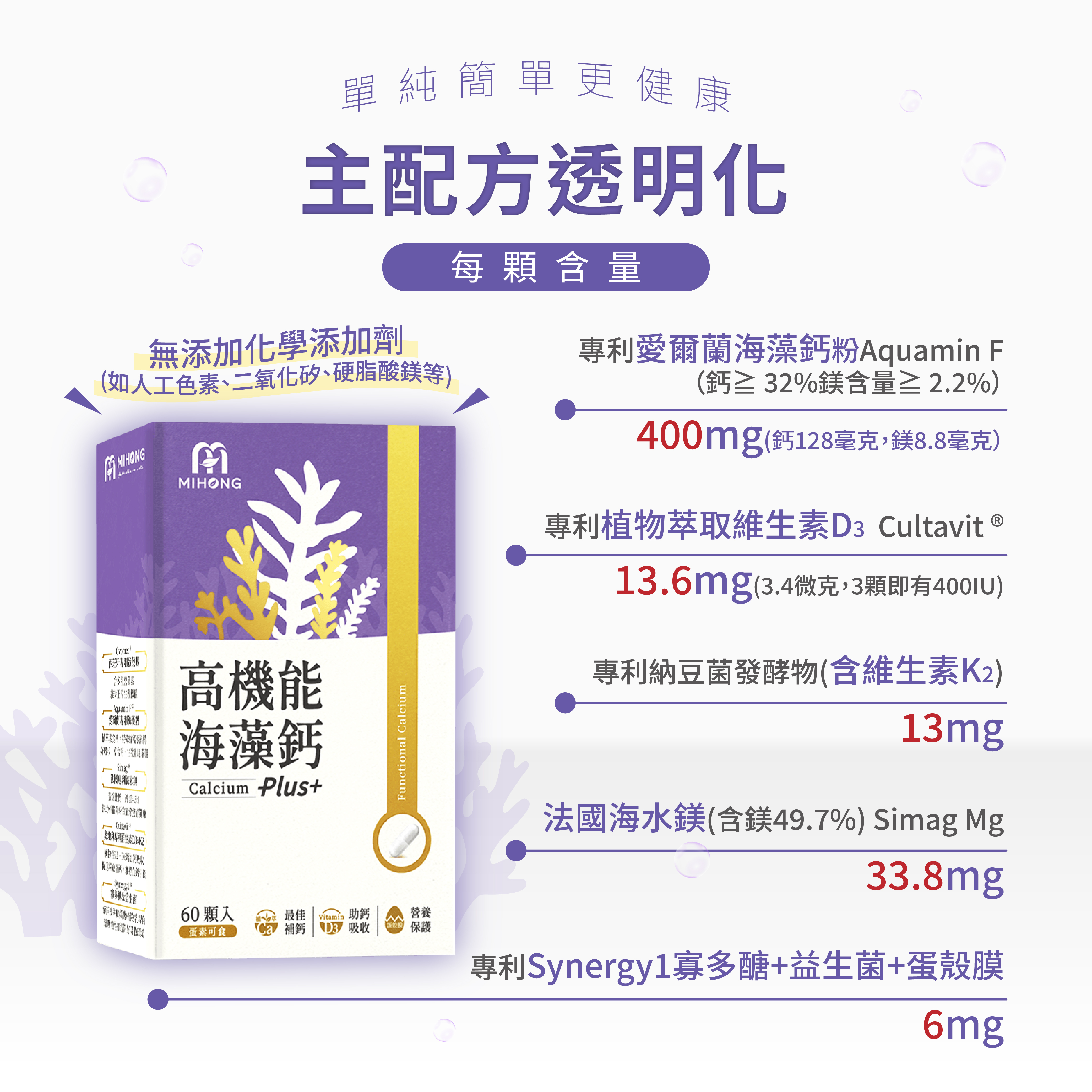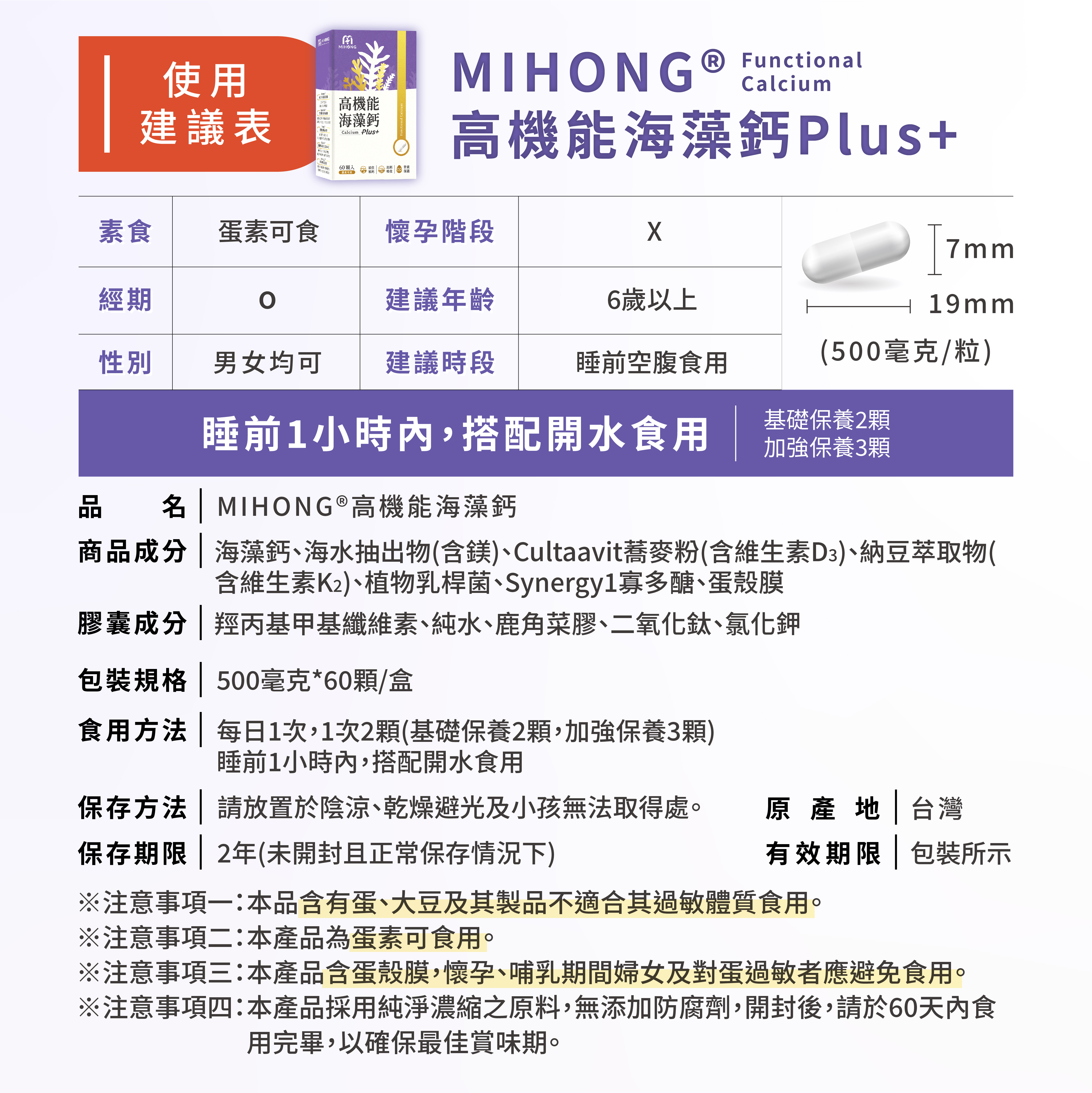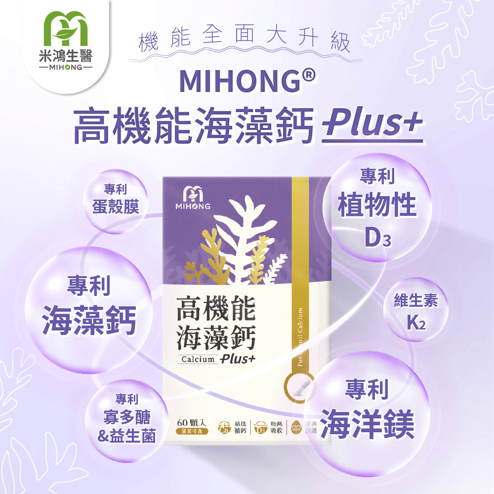 🌊MIHONG®高機能海藻鈣Plus再升級!嚴選6款原料相輔相成,打造高效補鈣5大協作機能,黃金關鍵三步驟運鈣-導鈣-鎖鈣,完成閉環補鈣,再添加蛋殼膜,有如守門員維護環境!完整補充鈣質,更有助於打造鈣質吸收好環境,一家老小一起來補充鈣質,蛋素者也適合食用哦!