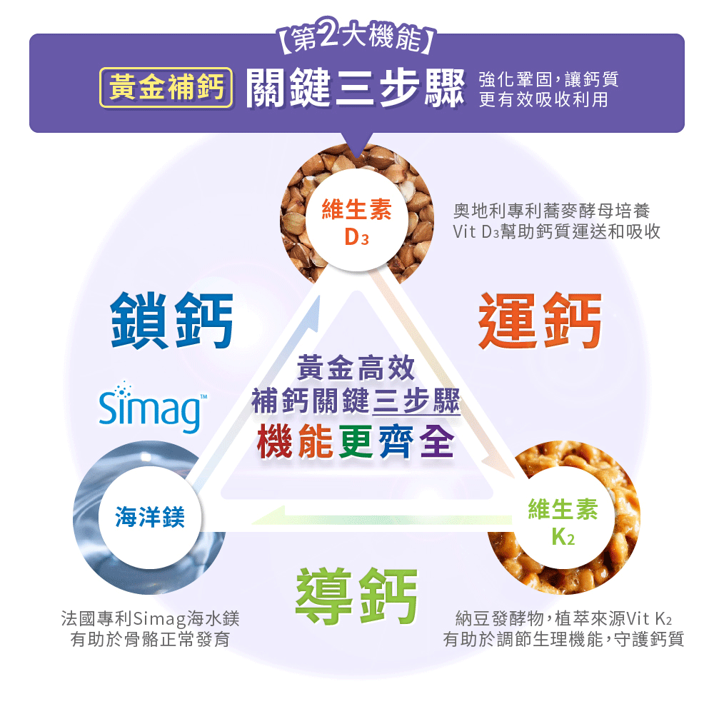 第2大機能:使用專利植物維生素D3,運鈣,幫助鈣質吸收納豆萃取維生素K2,鈣質守門員,幫助留住鈣質,強化作用。法國海水鎂,有助骨骼與牙齒正常發育。