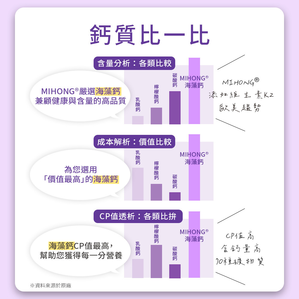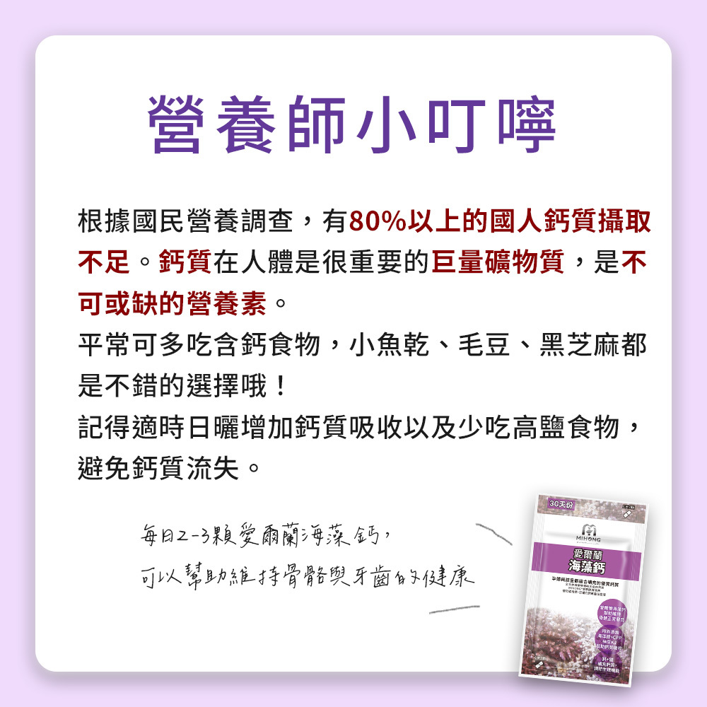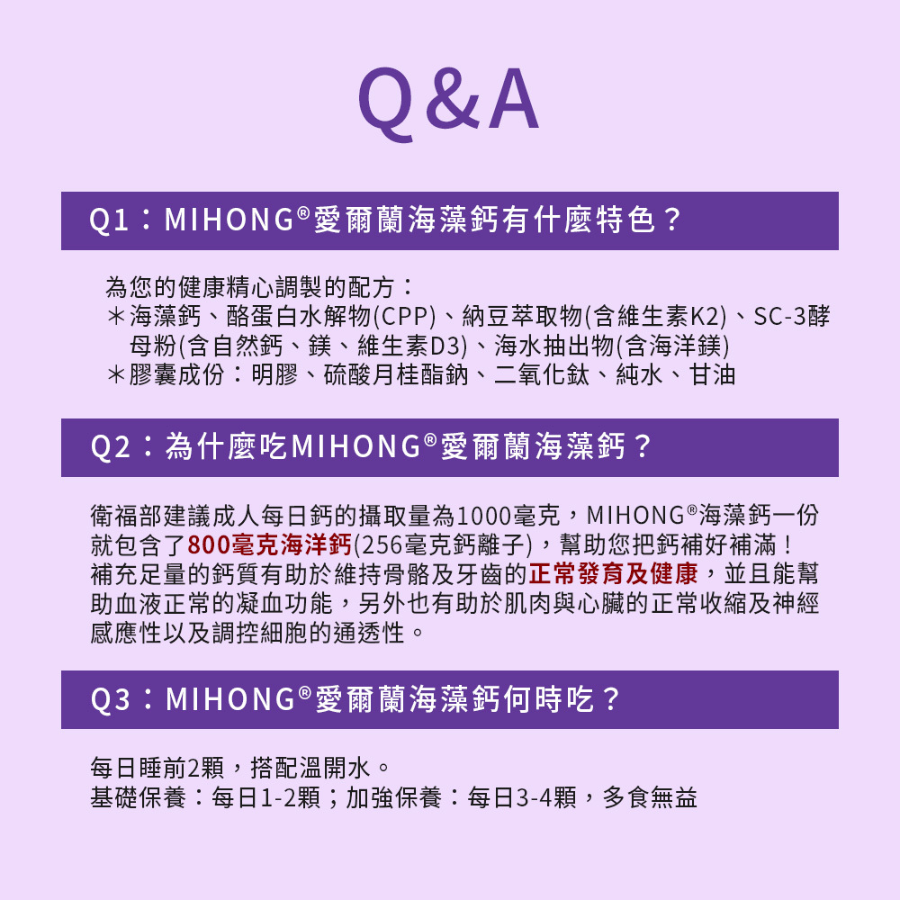 A:衛福部建議成人每日鈣的攝取量為1000毫克,MIHONG®海藻鈣一份就包含了800毫克海洋鈣(256毫克鈣離子),幫助您把鈣補好補滿!