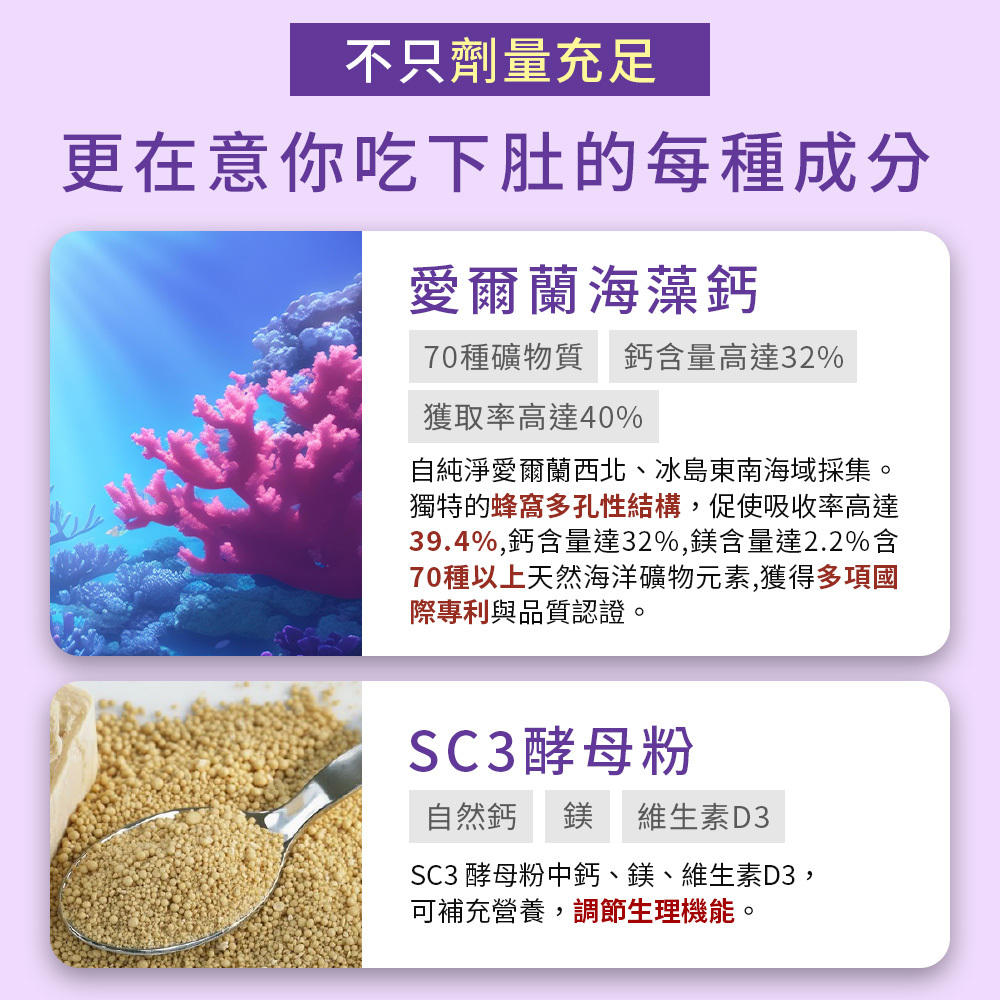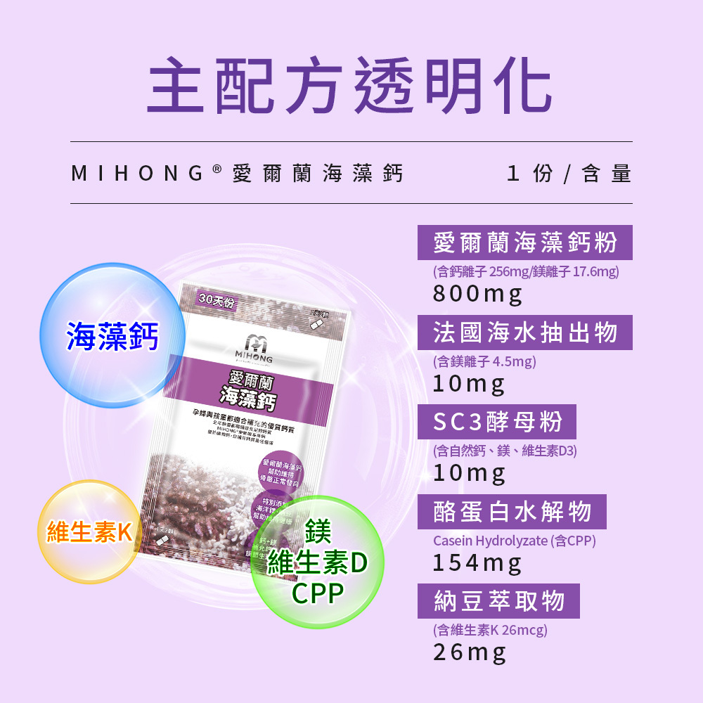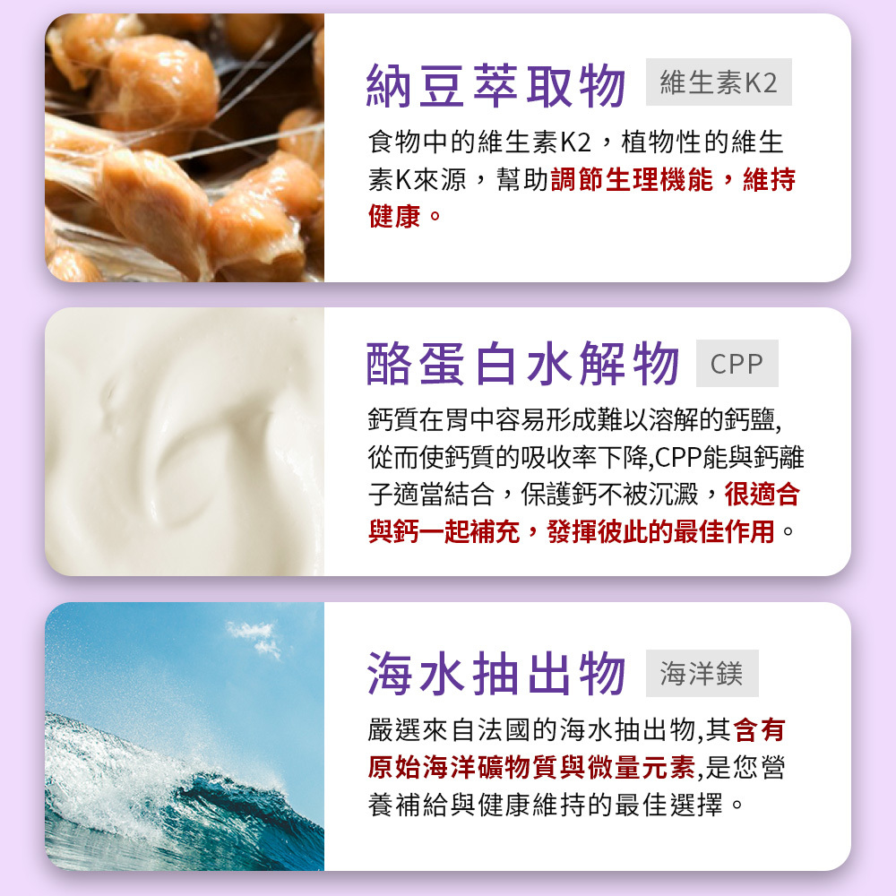 商品成份:海藻鈣、酪蛋白水解物(含CPP)、納豆萃取物(含維生素K2)、SC3酵母粉(含鈣、鎂、維生素D3)、海水抽出物(含海鎂)
