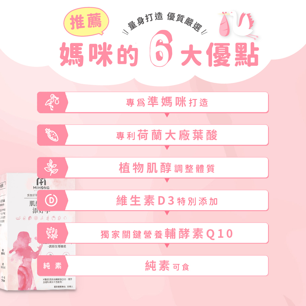🙋♀️MIHONG®蔬食好孕媽咪系列,根據亞洲飲食習慣,參照國人膳食營養素量身調配媽咪營養補充品,素食也能食用,讓素食媽咪好安心。