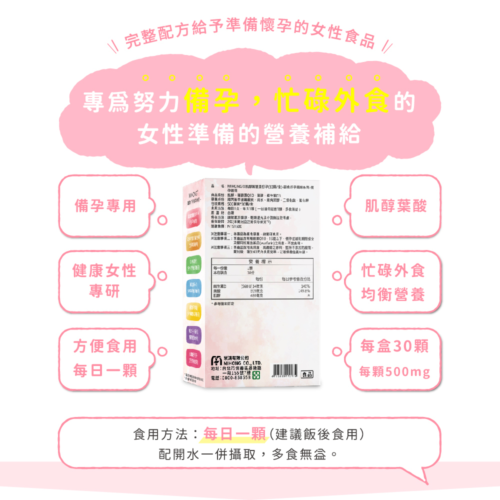 🙋♀️MIHONG® 肌醇葉酸添好孕(30顆/盒) - 蔬食好孕媽咪系列 - 備孕適用,專為備孕媽咪打造好孕的關鍵營養成分,雙效肌醇葉酸幫助媽咪養成好體質,培育合適環境,喜迎寶寶!