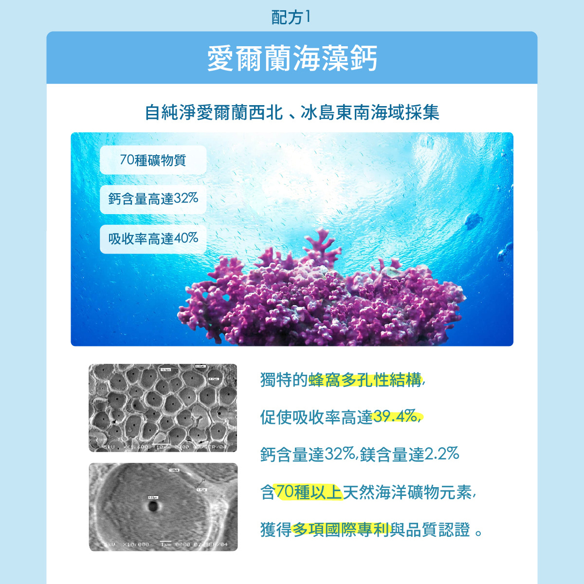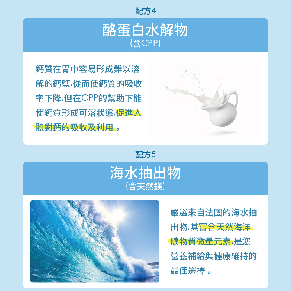 商品成份:海藻鈣、酪蛋白水解物(含CPP)、納豆萃取物(含維生素K2)、SC3酵母粉(含鈣、鎂、維生素D3)、海水抽出物(含海水鎂)