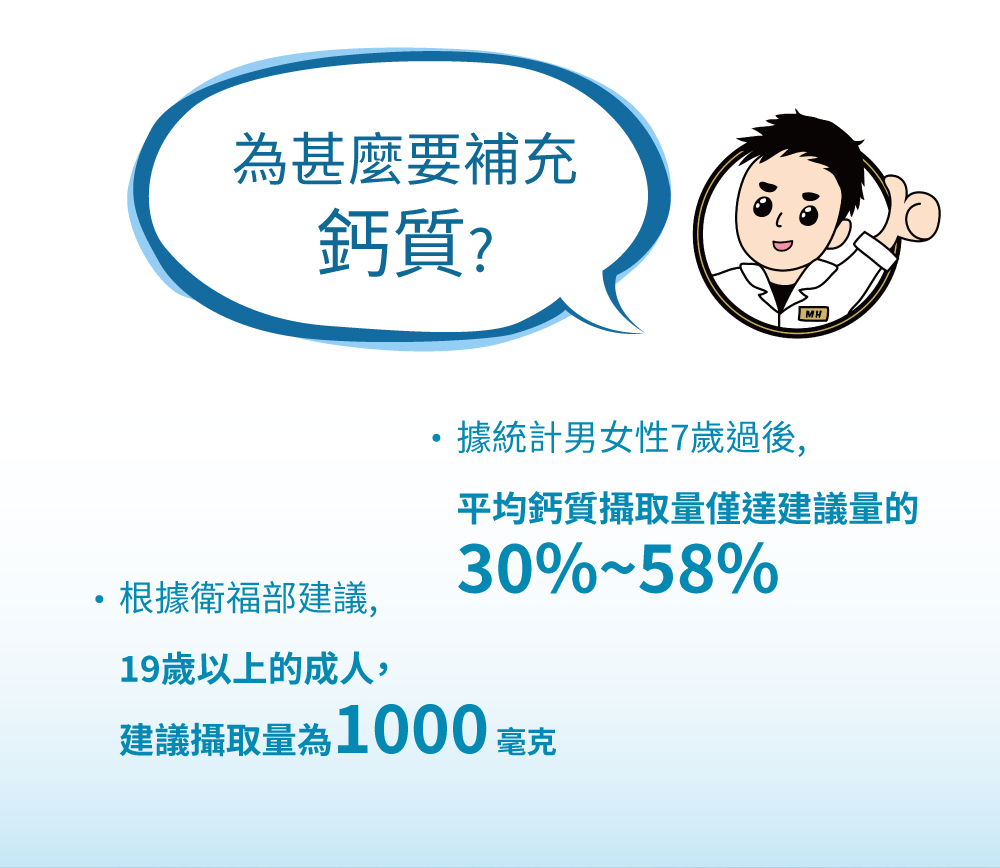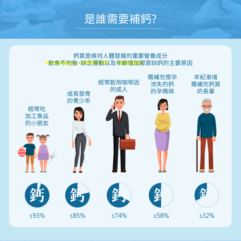 Q:誰特別需要補充鈣質? A: 國高中生、成年人、孕婦、老年人,尤其孕媽咪從懷孕初期邊可以開始補充,因為普遍孕婦都有缺鈣的狀況,一開始便可以打好鈣質基礎。