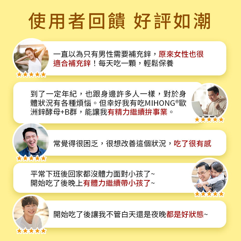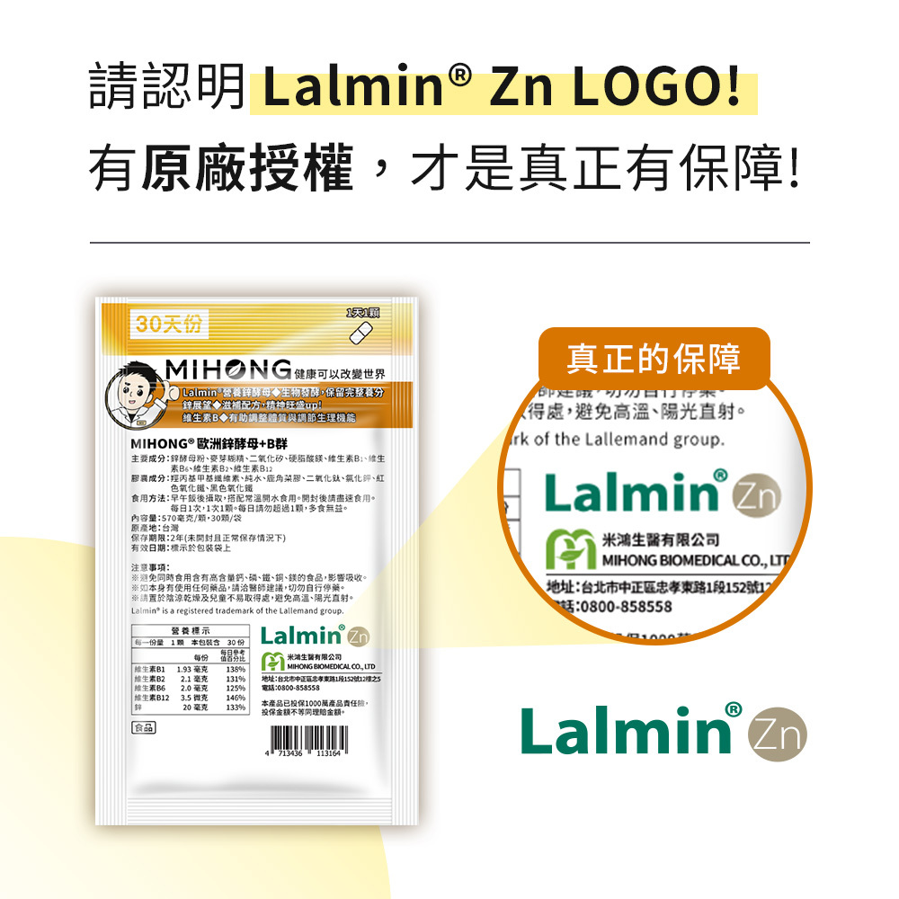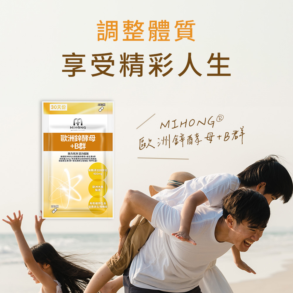 👨👩👧MIHONG®歐洲鋅酵母+B群,選擇歐洲大廠製造Lalmin®天然營養鋅酵母為主角400mg足量添加!搭配維生素B群,幫助調節生理機能,精神旺盛! 適合各年齡層的大小朋友 。產品經過第三方檢驗和認證,為消費者提供放心且有保障的優質品質,讓您安心食用,輕鬆享受健康活力。