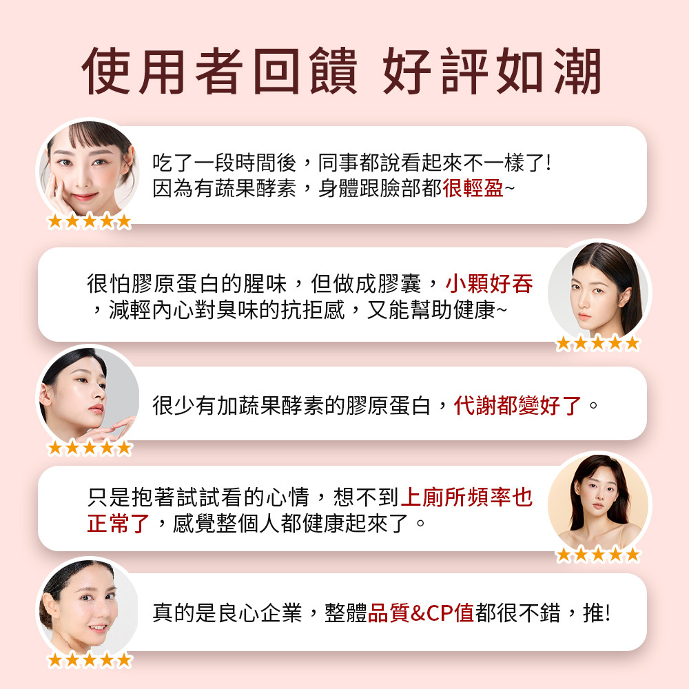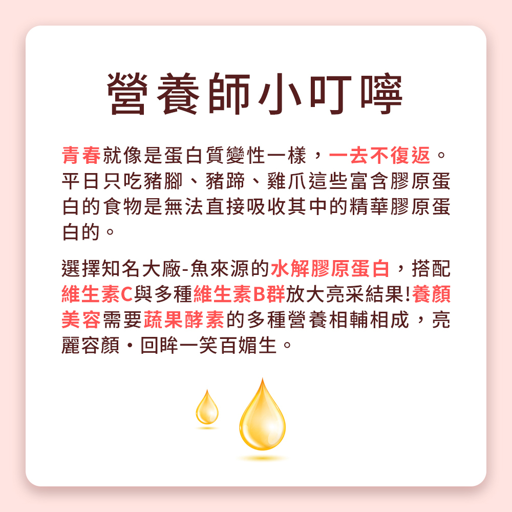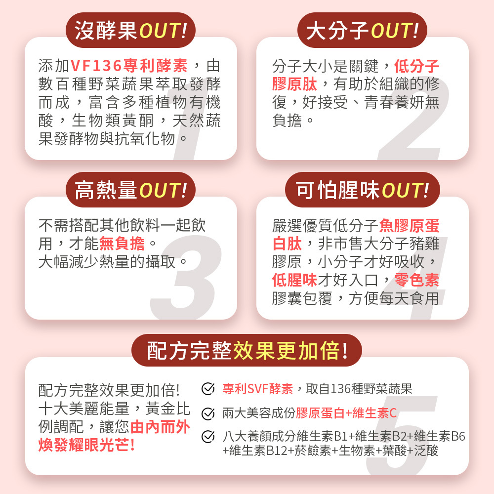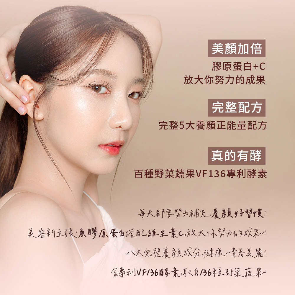 💁養顏好習慣!蔬果酵素+B群+魚膠原蛋白每天都要努力補充,養顏好習慣! 美容新主張!魚膠原蛋白搭配維生素C,放大你努力的成果- 養顏正能量!八大完整養顏成分,好健康- 打造青春美麗!含專利VF136酵素,取自136種野菜蔬果-