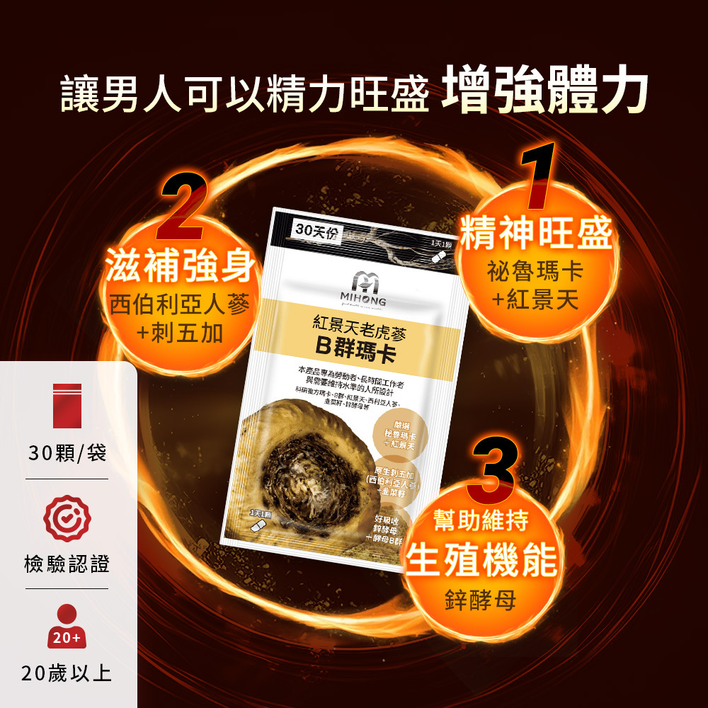 嚴選秘魯瑪卡B群增強體力,西伯利亞人參,酵母鋅與紅景天好吸收,讓男人可以精神旺盛,增強體力!