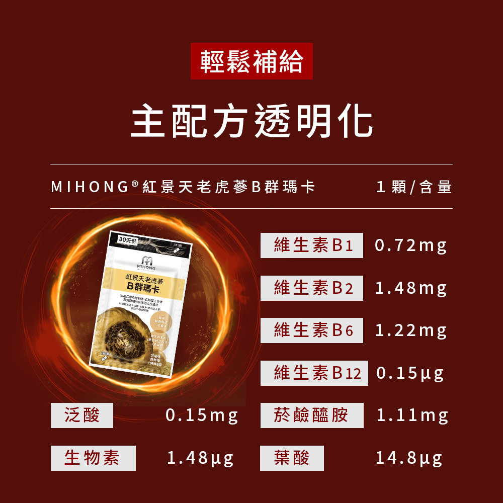 每一份量1顆,本包裝含30份。每份(維生素B1 0.72毫克,維生素B2 1.48毫克,維生素B6 1.22毫克,維生素B12 0.15微克,菸鹼素 1.11毫克NE,葉酸14.8微克,泛酸0.15毫克,生物素1.48微克)。每日參考值百分比(維生素B1 51%,維生素B2 93%,維生素B6 76%,維生素B12 6%,菸鹼素 6%,葉酸 4%,泛酸 3%,生物素 5%)。 【其他營養成份】祕魯馬卡 250毫克,西伯利亞人蔘(刺五加萃取)100毫克,韭菜籽55毫克,酵母鋅30毫克,紅景天2.5毫克)。
