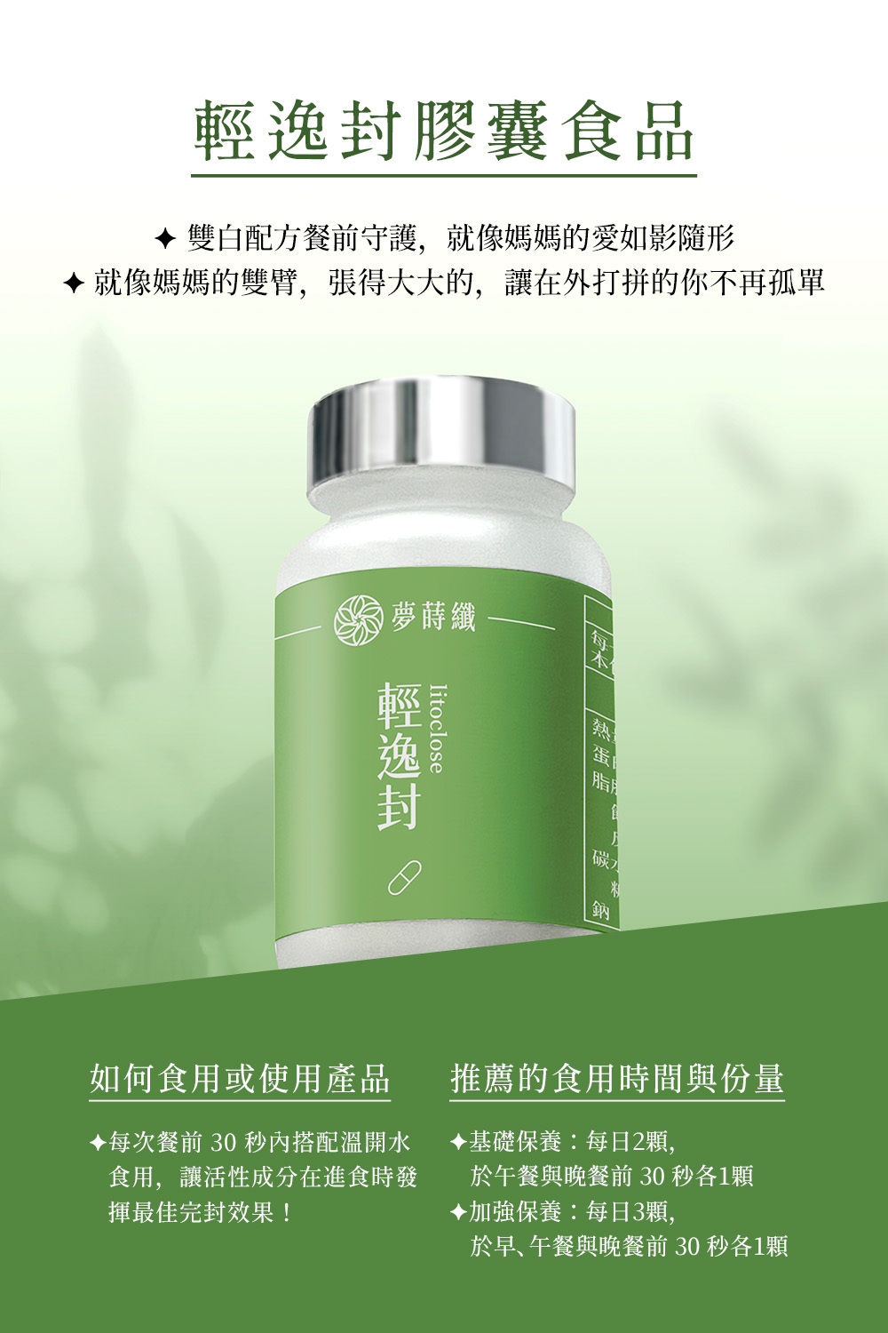 A: 三餐飯前食用1粒,可再搭配輕逸滿、輕逸燃與輕逸纖,效果加乘!