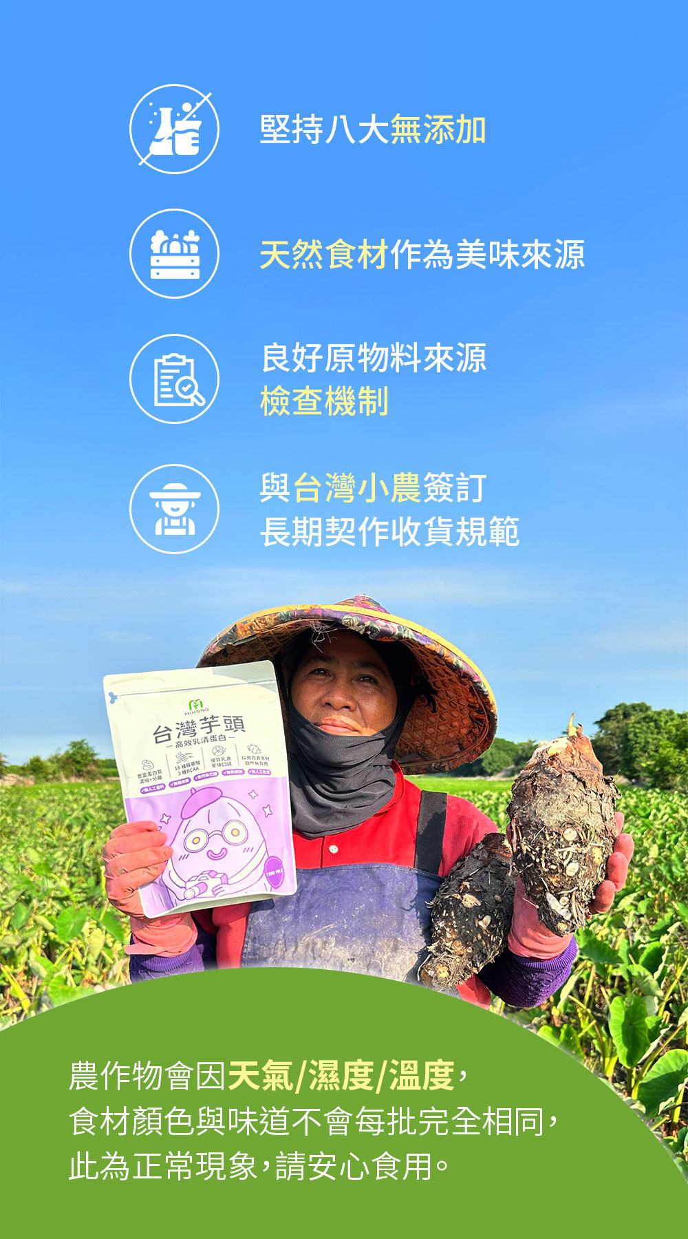 真實食材-原食材添加,保有原有食材該有的本質與風味,美味百卡的飽足小農蛋白飲,拒絕人工化合物濫竽充數,自然健康是第一首選。
