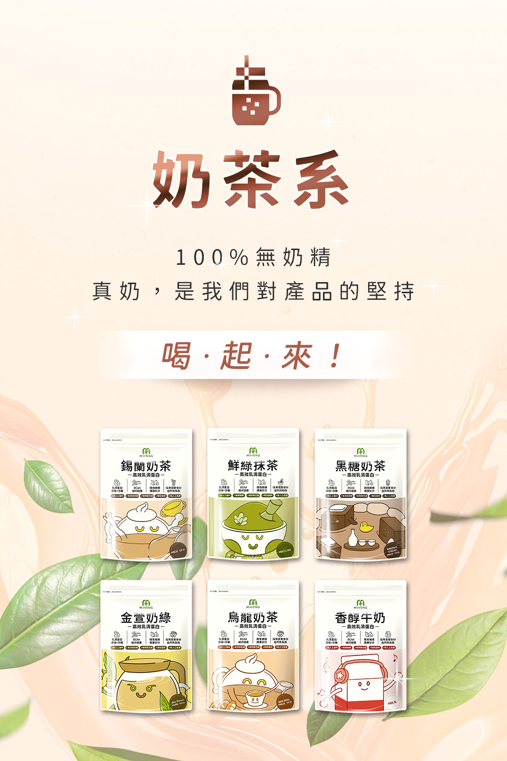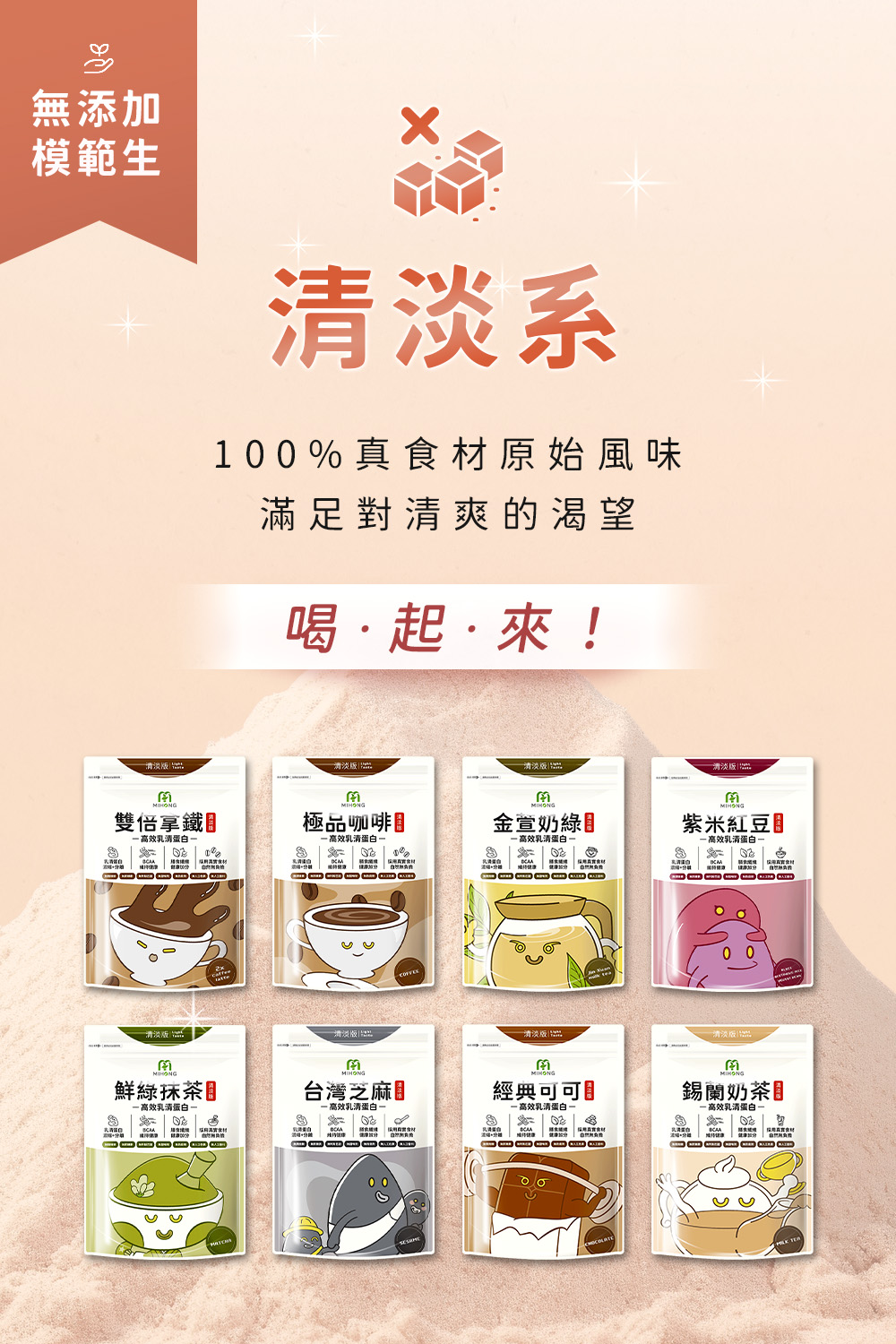 MIHONG®多口味高效乳清蛋白.主打分離+濃縮的優質乳源形式;MIHONG®多口味高效燕麥奶,主打水解+分離的燕麥奶植物蛋白形式,承襲無調味經典的多口味選擇;MIHONG®高效乳清蛋白-限量系,主打水解+分離的優質乳清與分離大豆蛋白結合,經研發不斷改良,無添加香料、色素,美味百卡的飽足小農蛋白飲,集健康與美味於一杯-補充一天蛋白質所需,從高效乳清蛋白開始-好喝的蛋白質,可用於肌肉生長,幫助調整體質,營養補給!