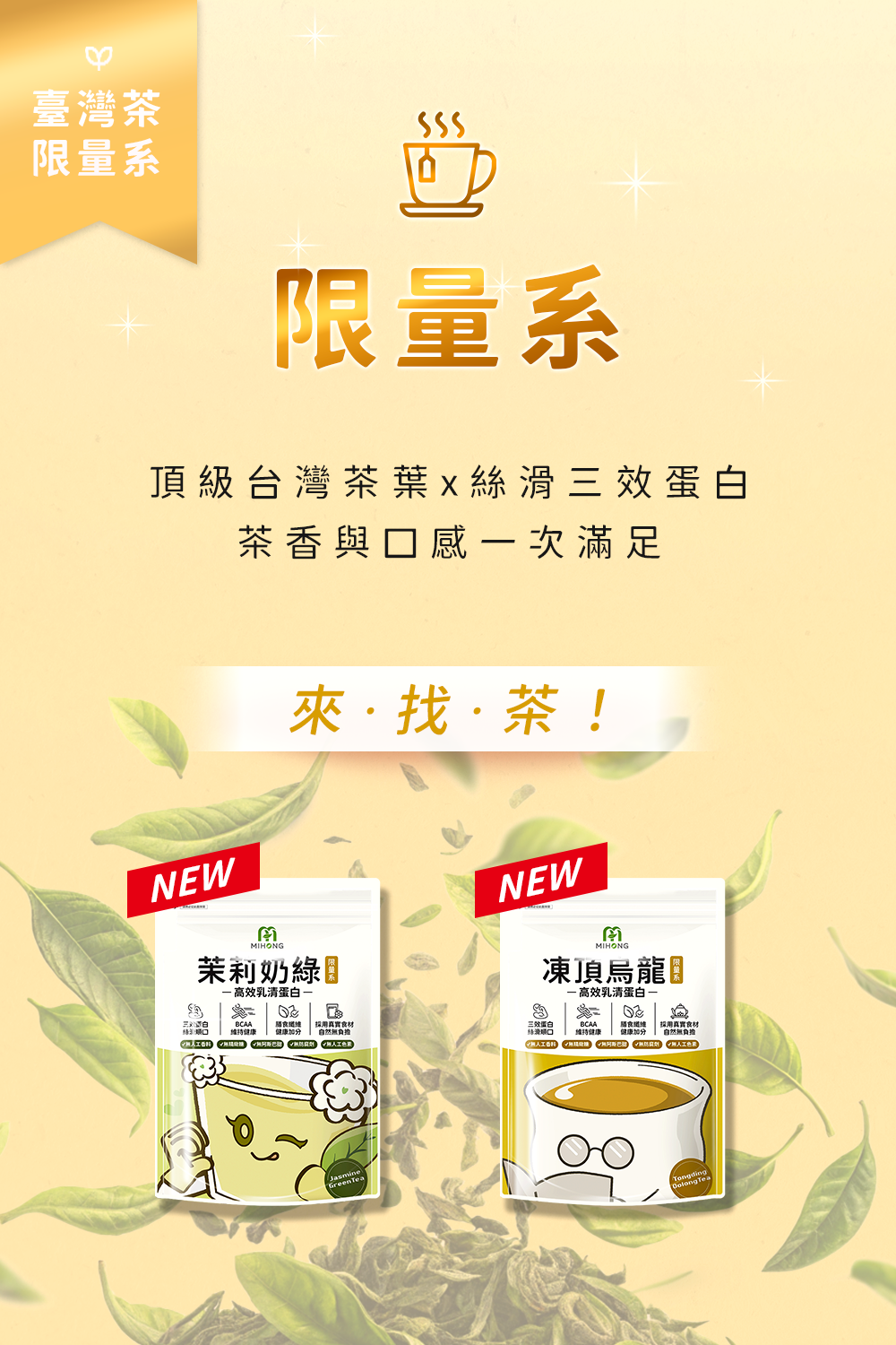 限量系嚴選頂級台灣茶葉研製成精工茶粉,採收與製程繁瑣,特別推出期間限定的高級茶香搭配絲滑三效乳清,讓獨特茶韻在口中昇華,給你極致的享受!
