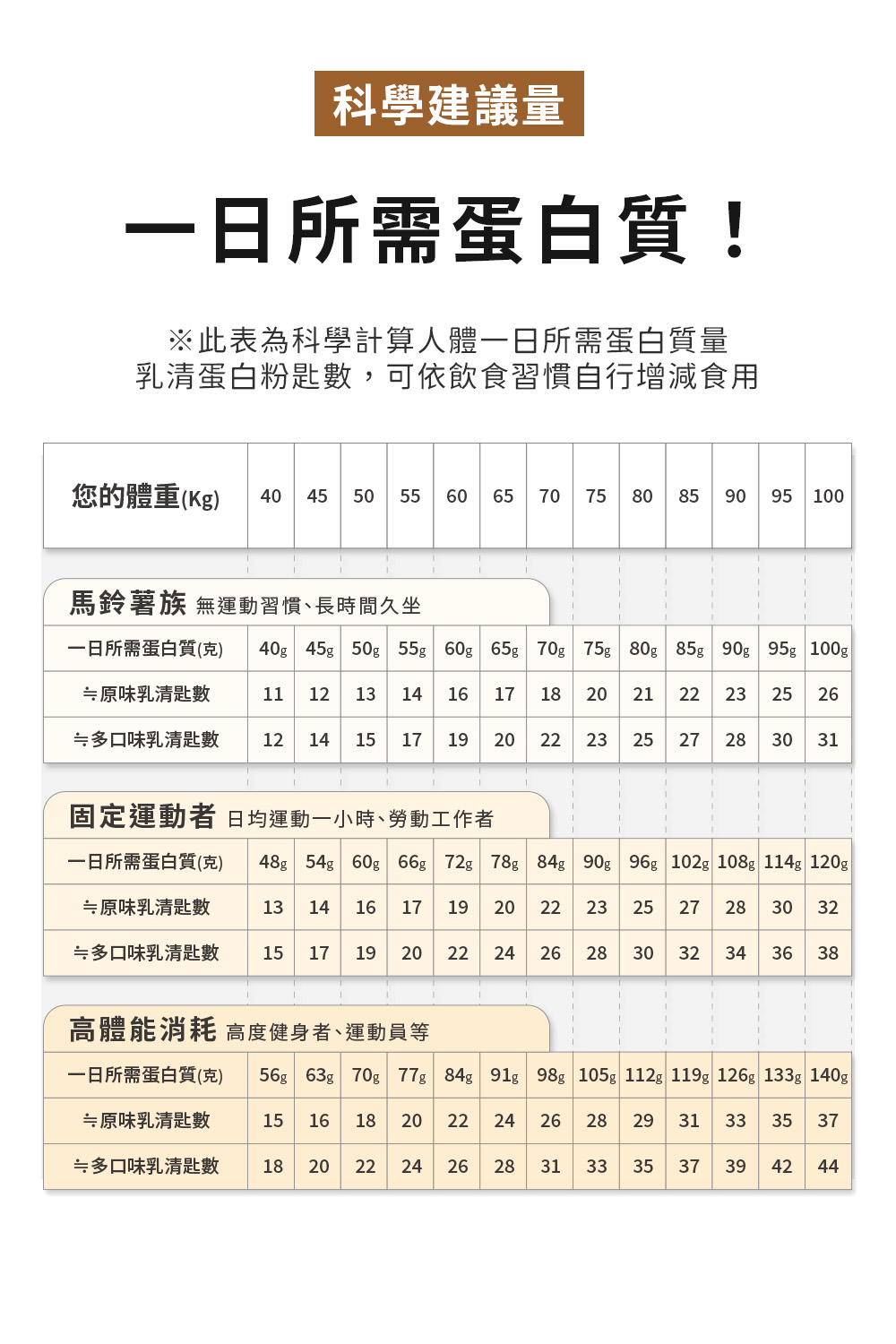 A:攝取量依據您的運動習慣與體重決定,計算方式如下: