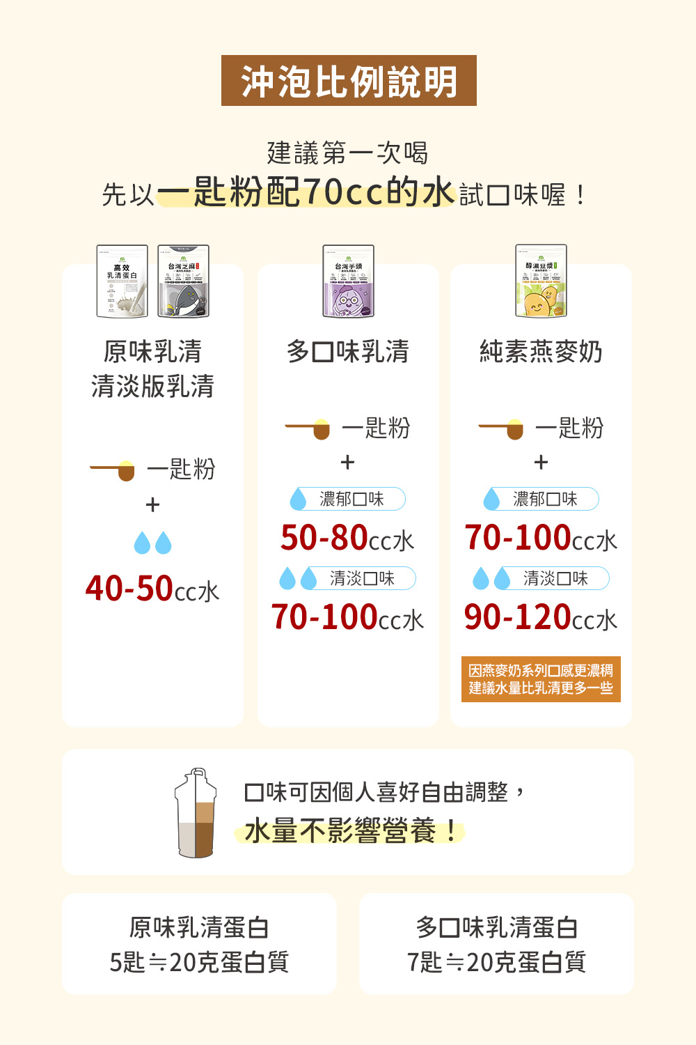 (小提醒:喜愛濃郁口味建議1匙配50~80c.c.的水量;喜愛一般口味建議1匙配70~100c.c.的水量,不影響乳清蛋白其效果。