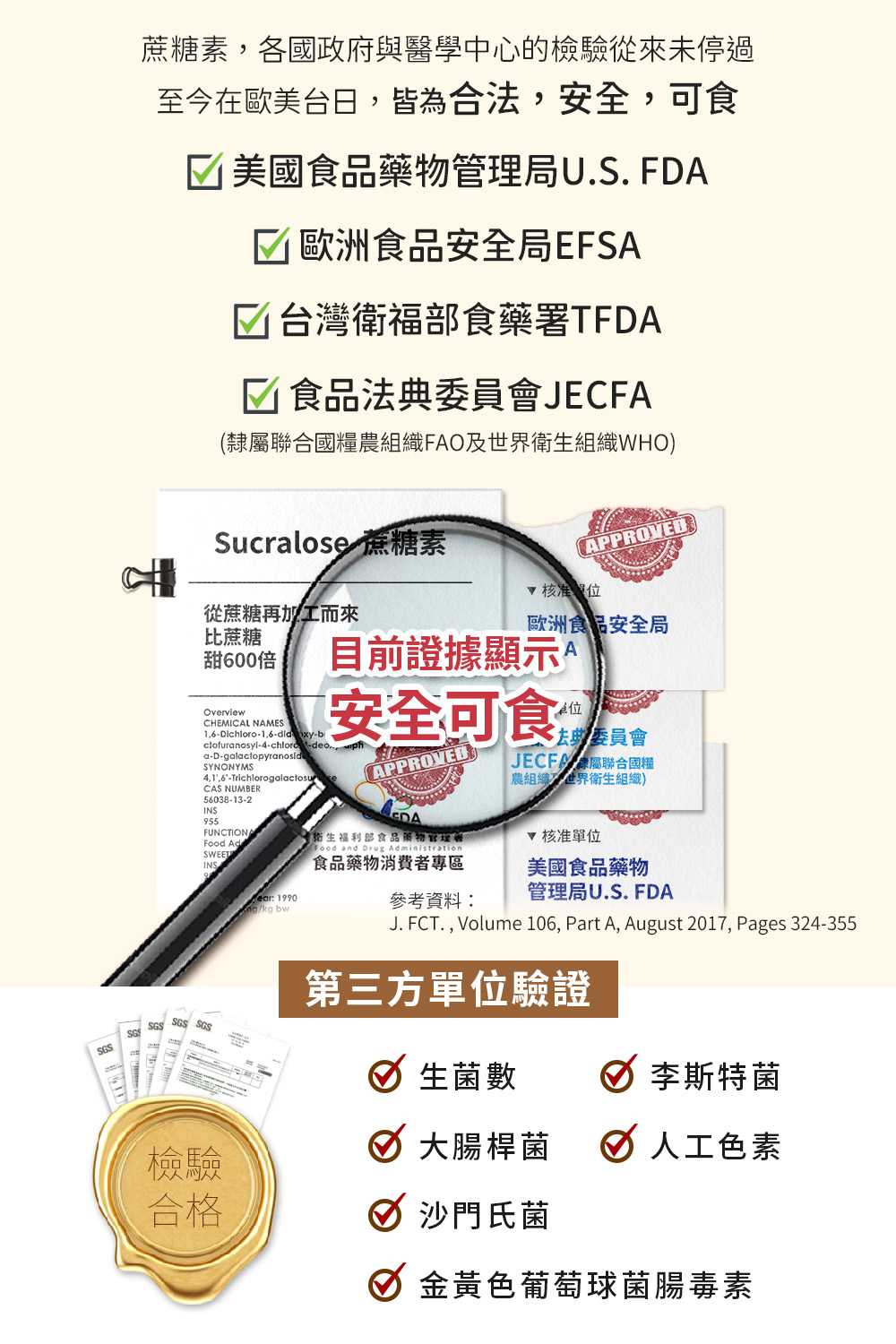 食在安心-通過第三方檢驗生菌數+大腸桿菌+大腸桿菌群,沙門氏菌、李斯特菌、金黃色葡萄球菌腸毒素、人工色素 ,乳品類衛生標準。