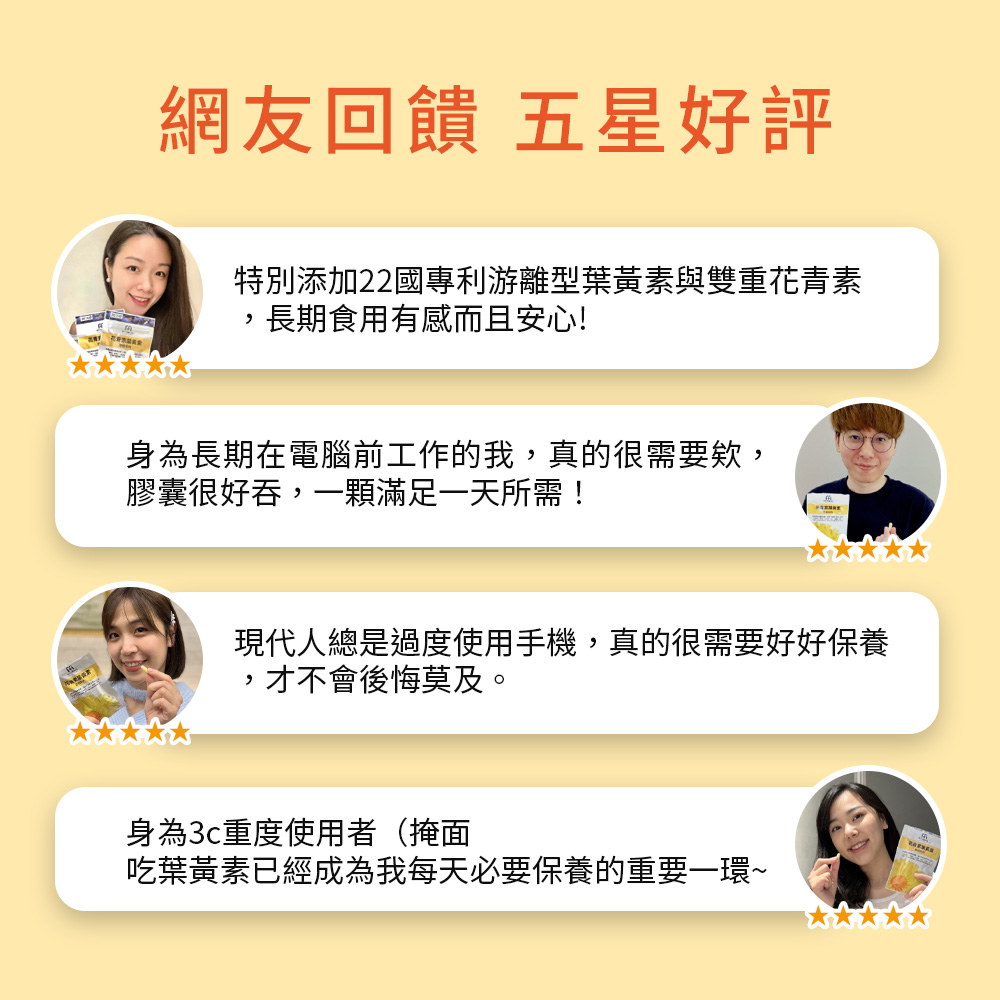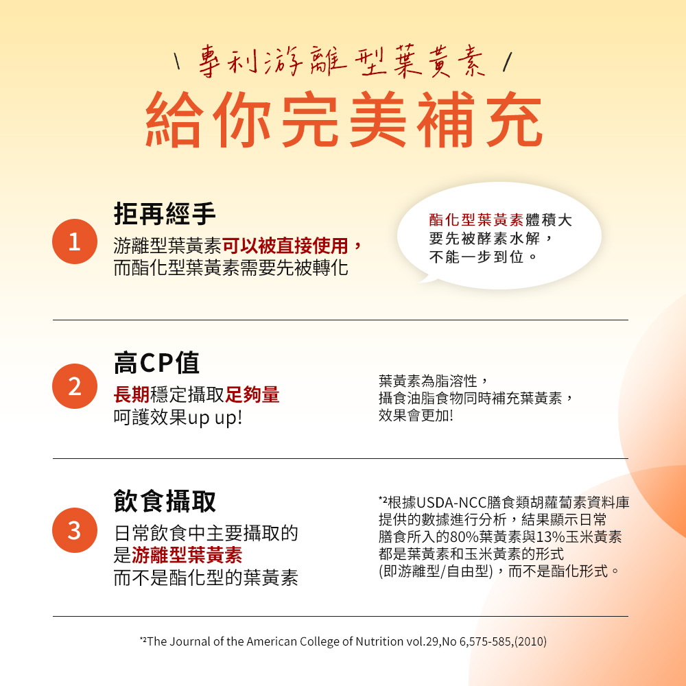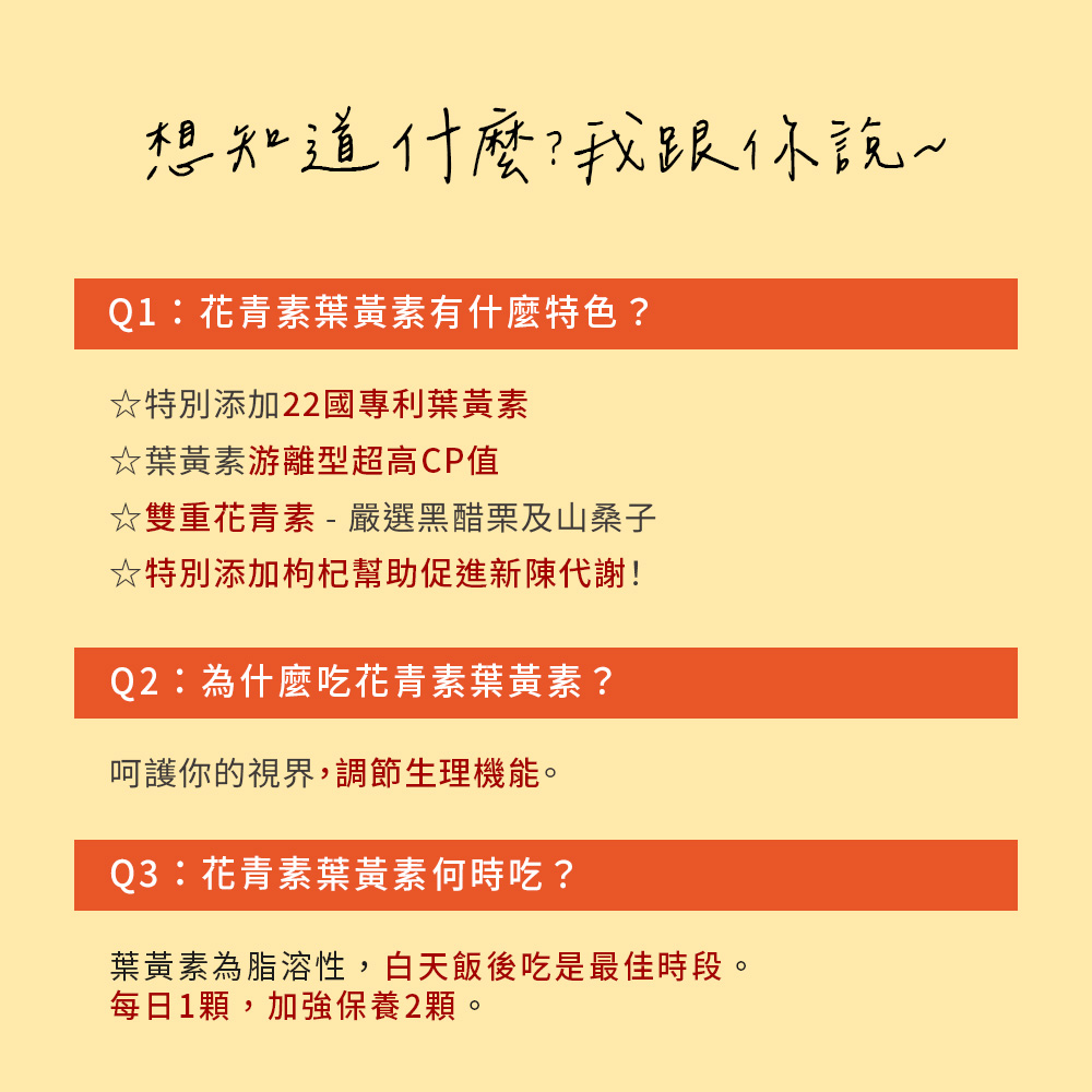 A:葉黃素為脂溶性,白天飯後吃是最佳時段。每日1顆,加強保養2顆。