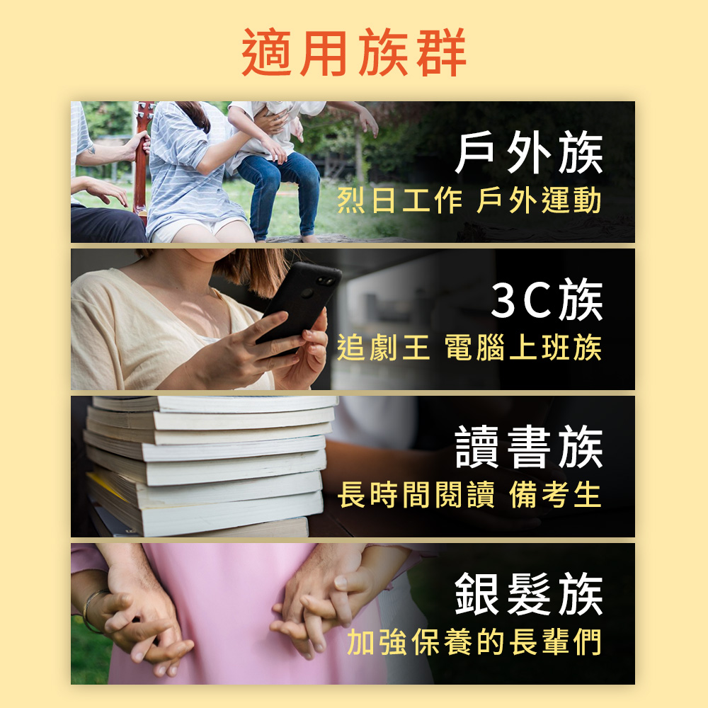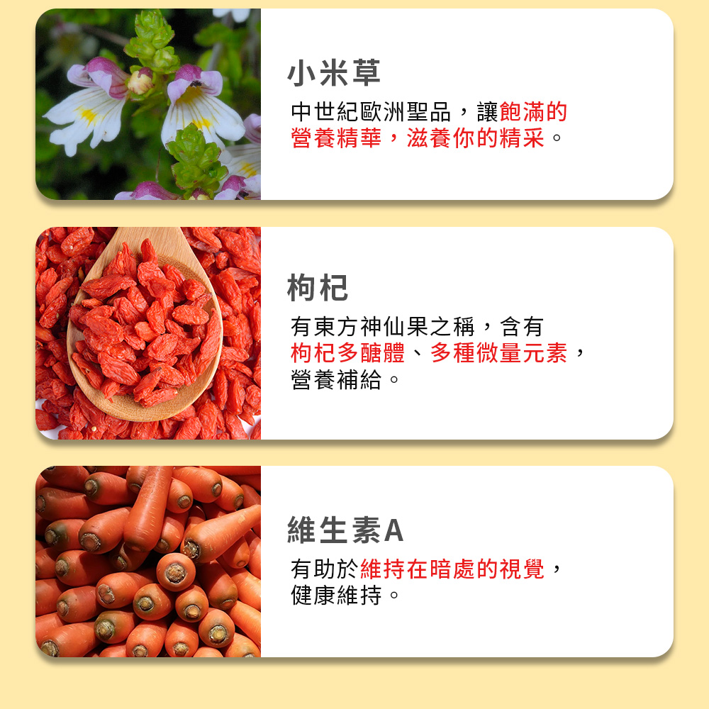【其他營養成分】金盞花萃取物(含葉黃素6毫克) 35毫克,山桑子萃取物25毫克,枸杞萃取物20毫克,小米草萃取物15毫克,黑醋栗萃取物5毫克,日本專利黑豆種皮1.5毫克。