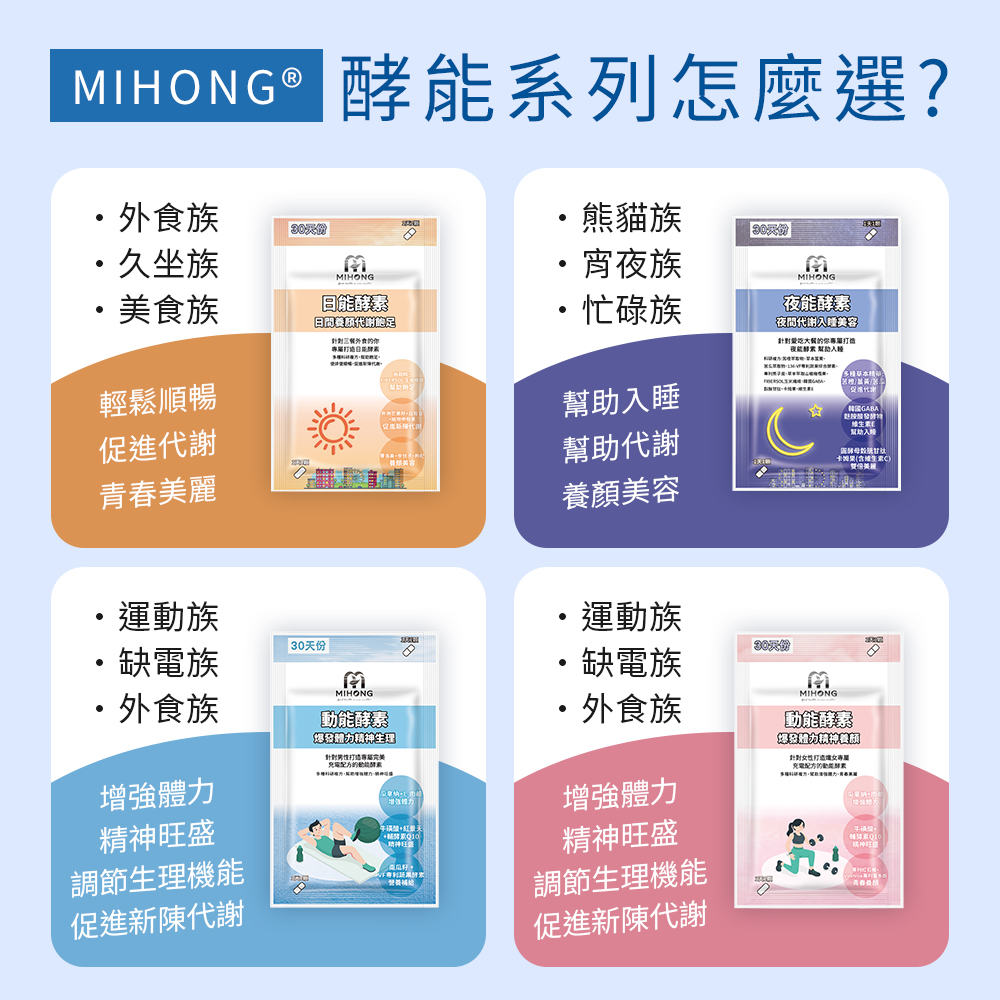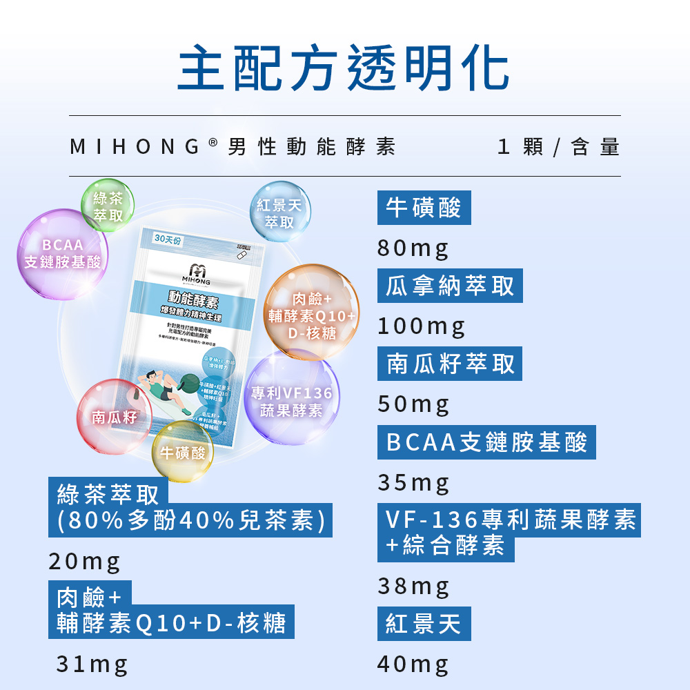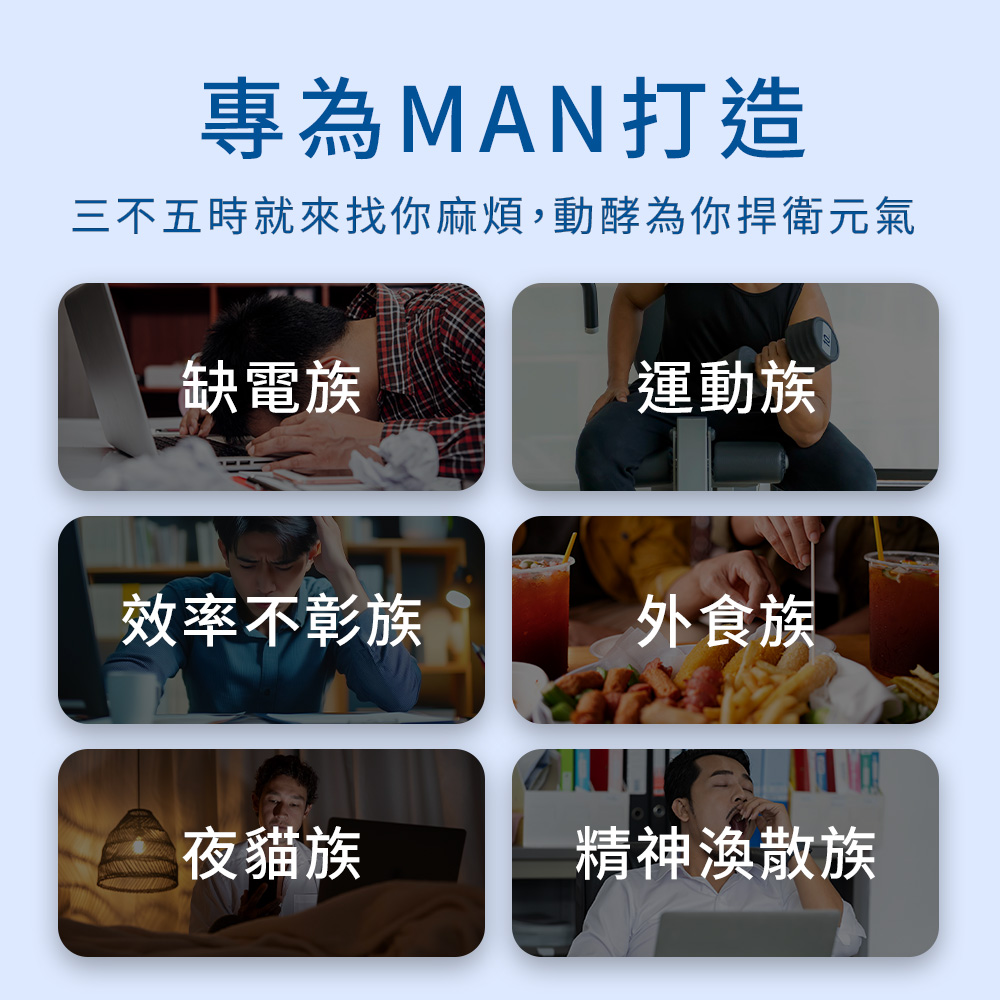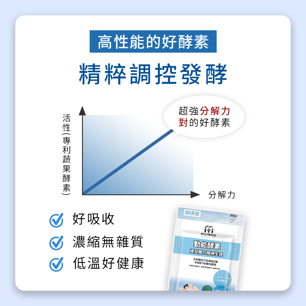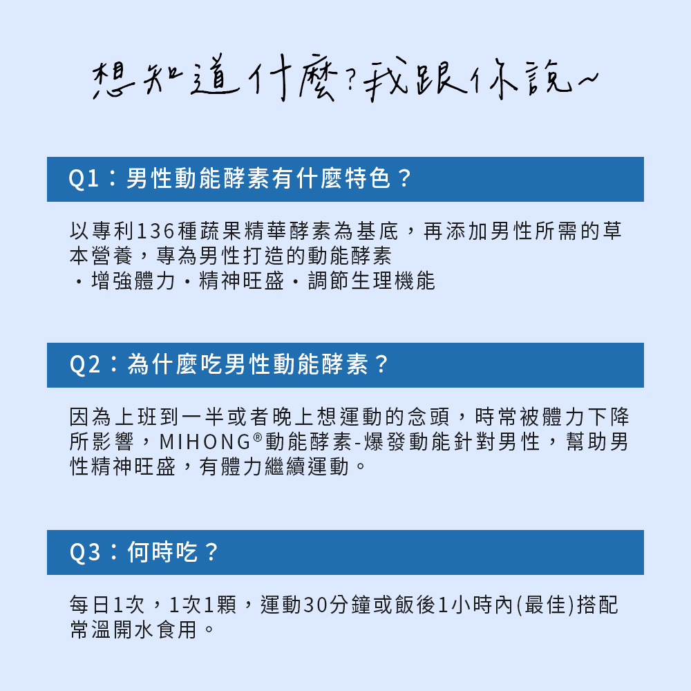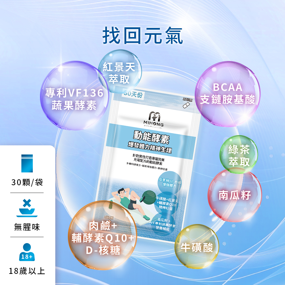 A:因為上班到一半或者晚上想運動的念頭,時常被體力下降所影響,MIHONG®動能酵素-爆發動能針對男性,幫助男性精神旺盛,有體力繼續運動。