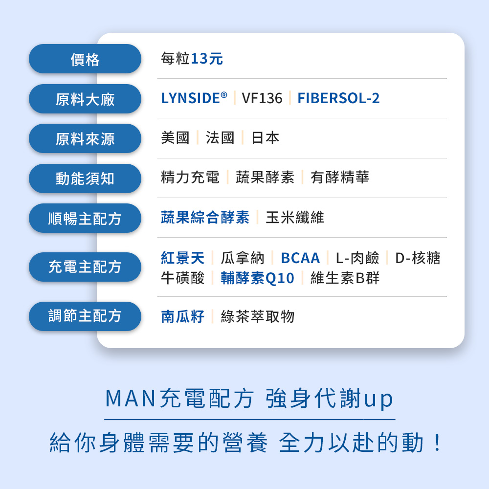 商品成分:瓜拿納萃取物、玉米來源可溶性纖維、牛磺酸、南瓜籽萃取物、紅景天萃取物、BCAA支鏈胺基酸、綠茶萃取物、VF136綜合蔬果發酵物(諾麗果、哈蜜瓜、茄子、苦瓜、冬瓜、紅蘿蔔、南瓜、馬鈴薯、胡瓜、絲瓜、小黃瓜、秋葵、青花椰菜、地瓜葉、地瓜、空心菜、芹菜、西洋芹、茭白筍、玉米、大白菜、菠菜、芥藍、小白菜、青江菜、黑豆、菜豆、敏豆、莧菜、黃豆芽、高麗菜、牛蒡、山藥、老薑、甜椒、青椒、紅鳳菜、A菜、巴西栗、檸檬、鳳梨、葡萄、番茄、青木瓜、梅子、蘋果、柚子、葡萄柚、柳丁、碰柑、甜橙、百香果、番石榴、棗子、紅棗、甜菜根、桑椹、李子、紅龍果、荔枝、龍眼、桃子、蓮霧、香菇、金針菇、黑木耳、草莓、藍莓、芒果、水蜜桃、青蘋果、蔓越莓、西印度櫻桃、水梨、白葡萄、康科特葡萄、山竹、枸杞、山桑子、黑醋栗、野櫻桃、酸櫻桃、余甘子、石榴、接骨木果、覆盆子(紅)、覆盆子(黑)、螺旋藻、綠藻、蕁麻、小麥草、大麥草、猴頭菇、迷你胡蘿蔔、香芹、羽衣甘藍、靈芝、舞茸、椎茸、巴西蘑菇、花椰菜芽、義大利鑽石花椰菜、羽衣甘藍菜芽、花椰菜、紅甘藍菜、紫甘藍菜、球花甘藍、澱粉酵素、木瓜酵素、蛋白酵素、脂肪酵素、橘子、木瓜、香蕉、萊姆、黃瓜、洋梨、荷蘭芹、萵苣、羅勒、玉米鬚、九層塔、大麥苗粉、小麥苗粉、小米草萃取物、小米萃取物、山楂果、西洋參、當歸、熟地、白芍、川芎、人蔘、桂圓、黑棗、奇異果)、綜合萃取物(鳳梨萃取物、糖化發酵物、脂肪發酵物、纖維發酵物、青木瓜萃取物)、輔酵素Q10、維生素B群(維生素B1、維生素B2、維生素B6、維生素B12、菸鹼醯胺、生物素、葉酸、泛酸)、L-肉酸、二氧化矽、D-核糖、啤酒酵母粉。