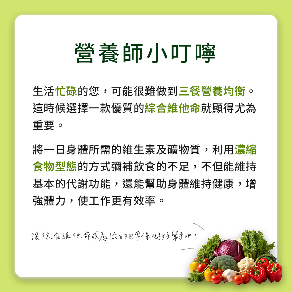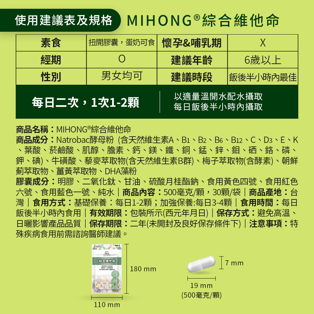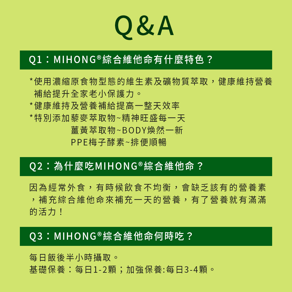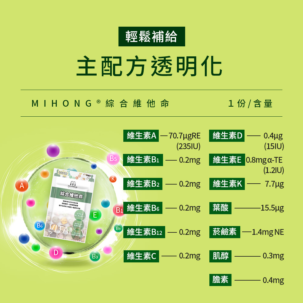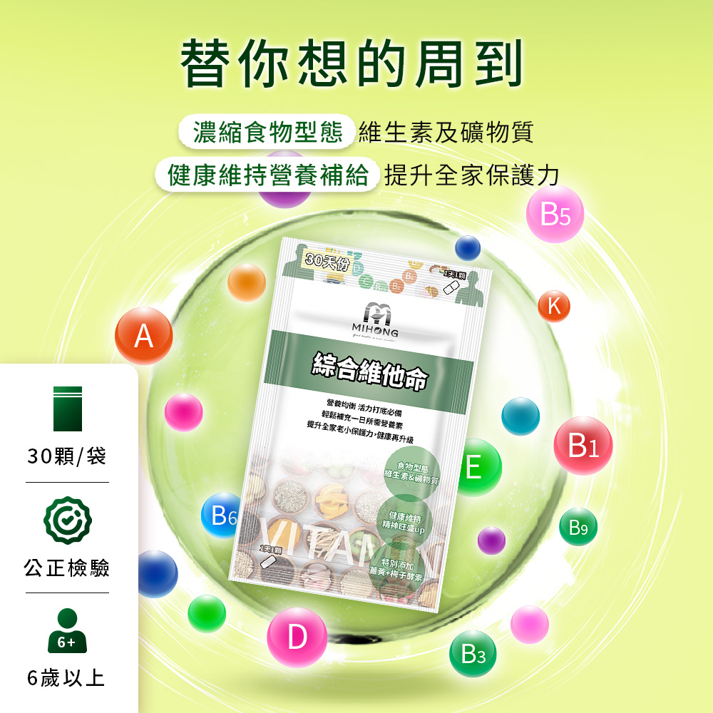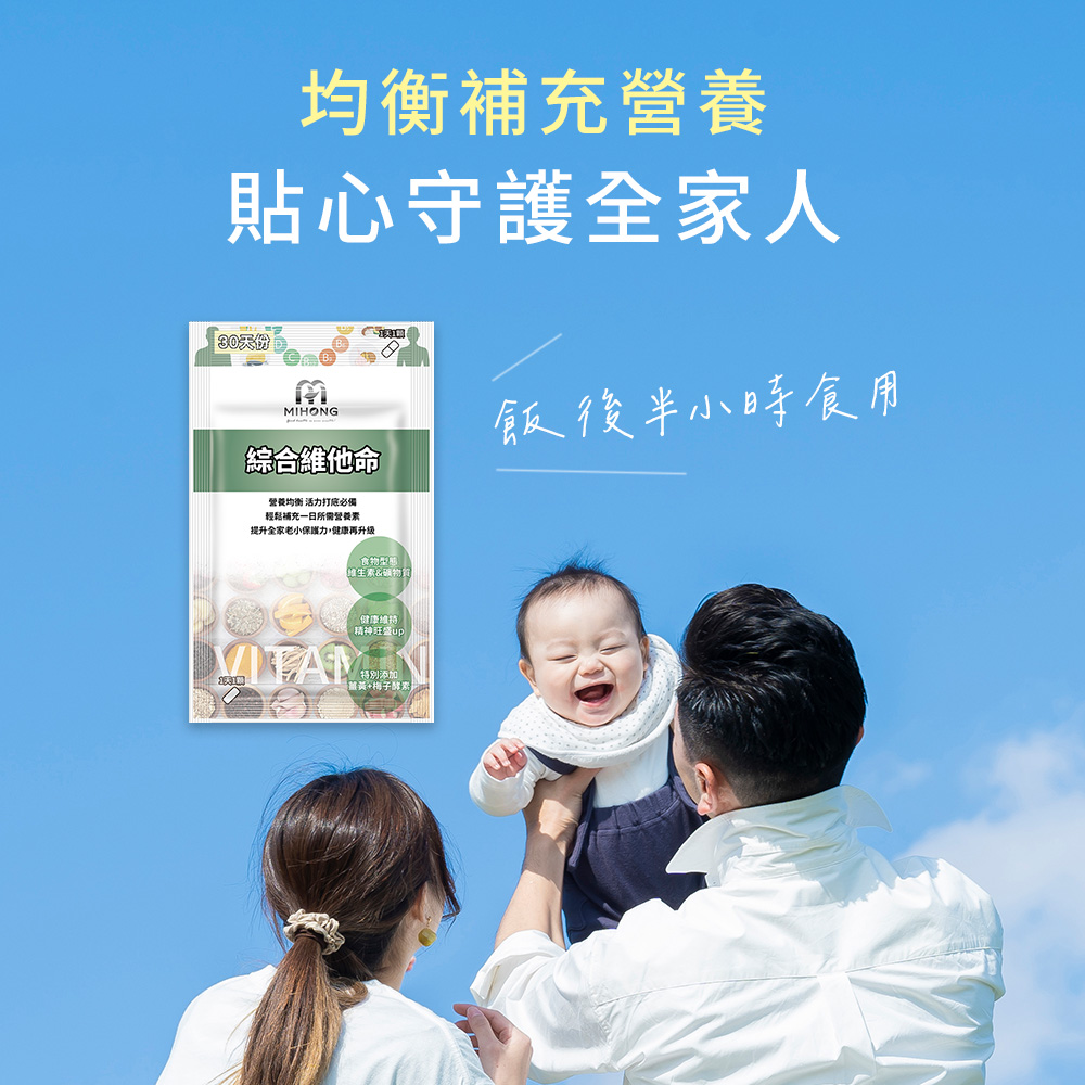 MIHONG®綜合維他命替大家想的周到,濃縮食物型態的維生素及礦物質,健康維持、緩慢釋放提升全家老小保護力。