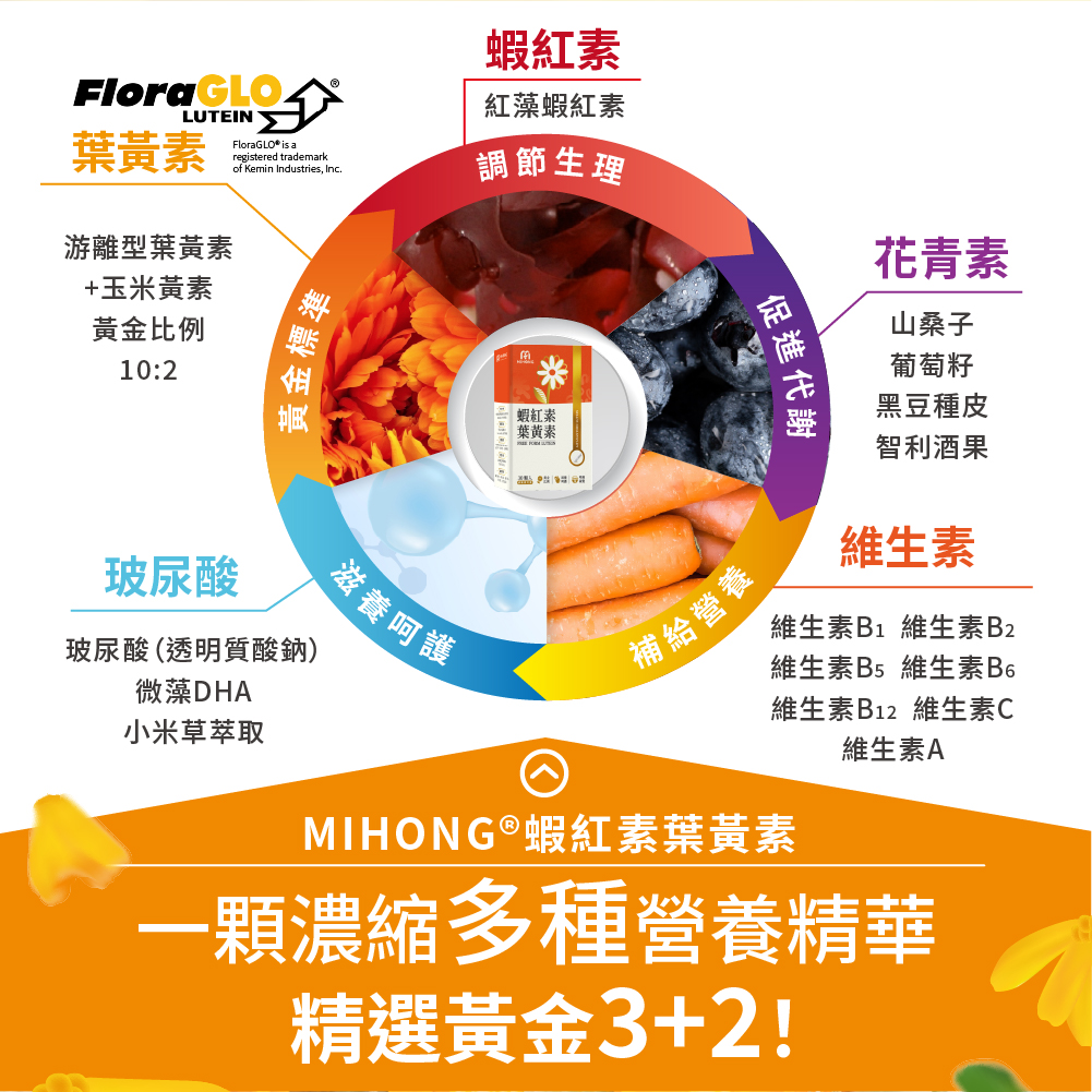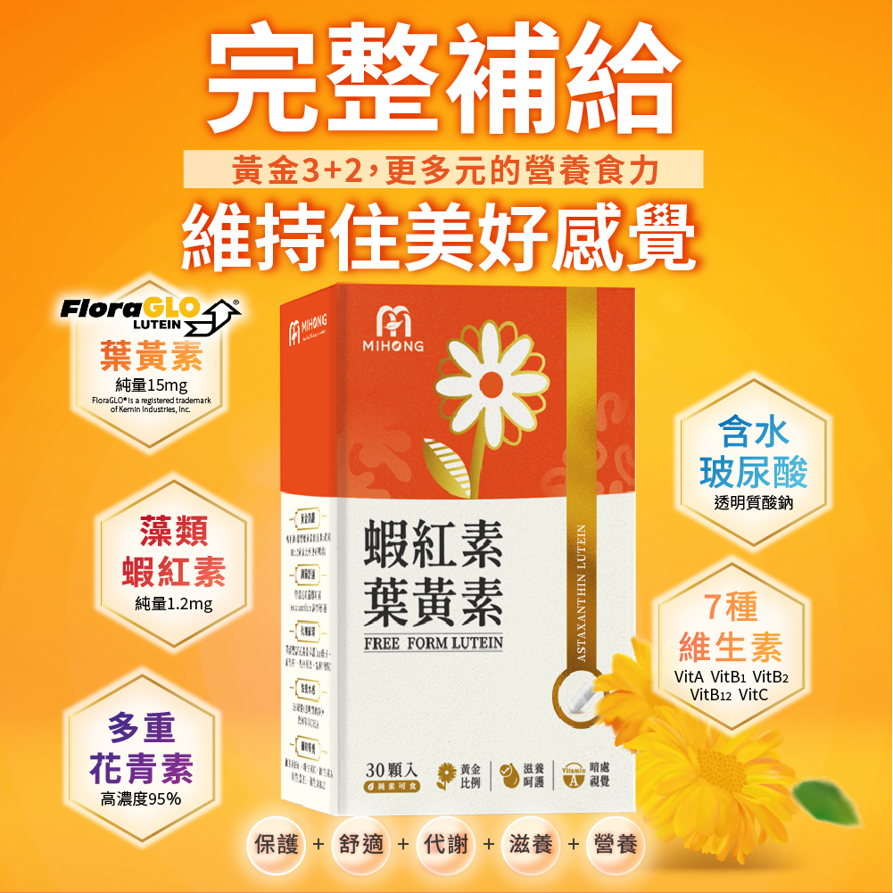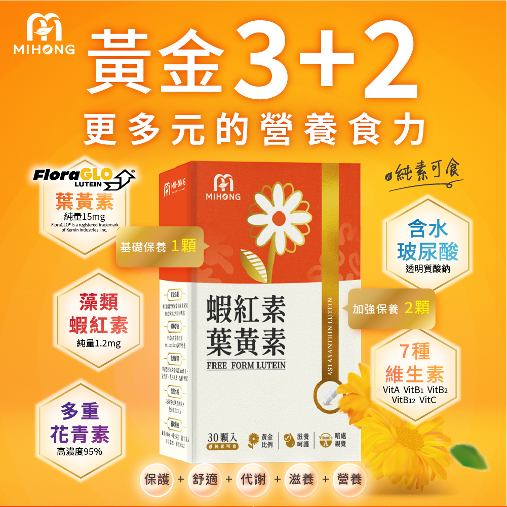 MIHONG®蝦紅素葉黃素,使用游離型葉黃素FloraGLO®和玉米黃素10:2黃金比例足量好補充、添加高濃度蝦紅素營養加倍、多種花青素幫助代謝、微藻DHA+玻尿酸滋養呵護、維生素A與多種維生素提供營養,再進化黃金3+2,更多元的營養食力!MIHONG®蝦紅素葉黃素皆為純素可食,無論是辛勞的上班族、學生族、迷弟迷妹、Gamer、青壯年、中老年人等,都適合闔家保養的好物。