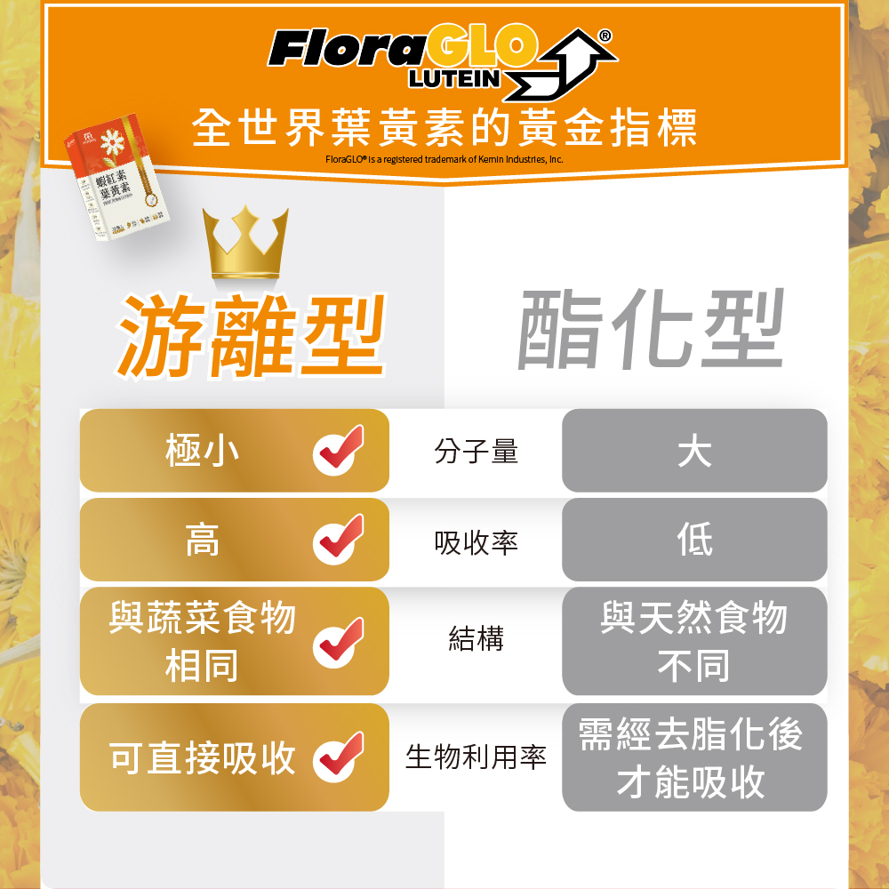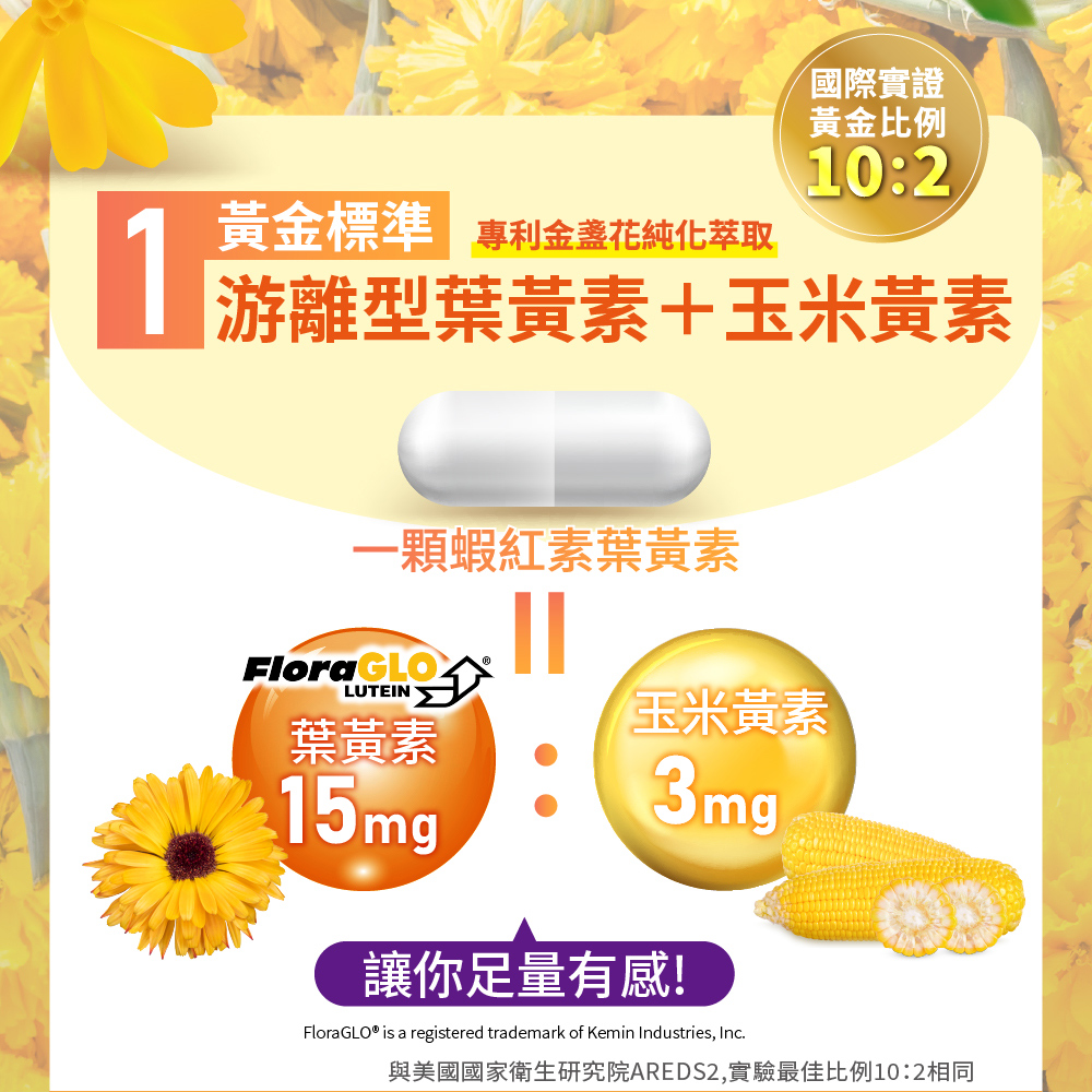 黃金比例再升級 ~使用游離型葉黃素FloraGLO®與玉米黃素-30:6,不僅黃金比例且足量好補充。