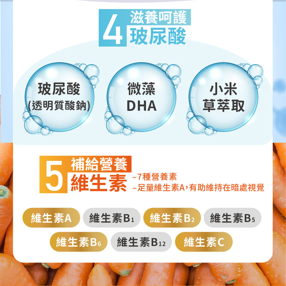 四.玻尿酸+微藻DHA添加 -玻尿酸為食品級的流行鏈球菌發酵物;微藻DHA能夠幫助補給更滿分 。