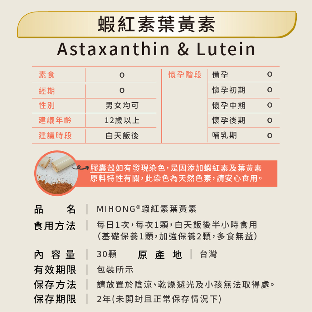 2.膠囊殼如有發現染色,是因添加蝦紅素及葉黃素原料特性有關,此染色為天然色素,請安心食用。