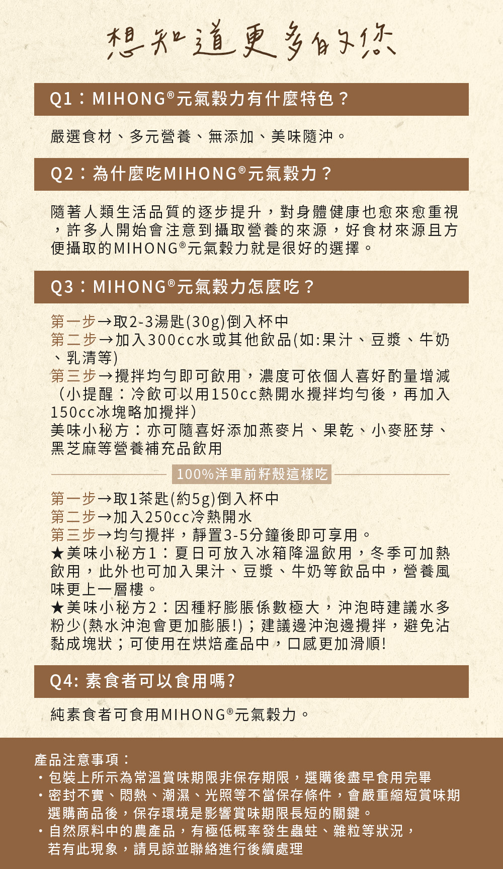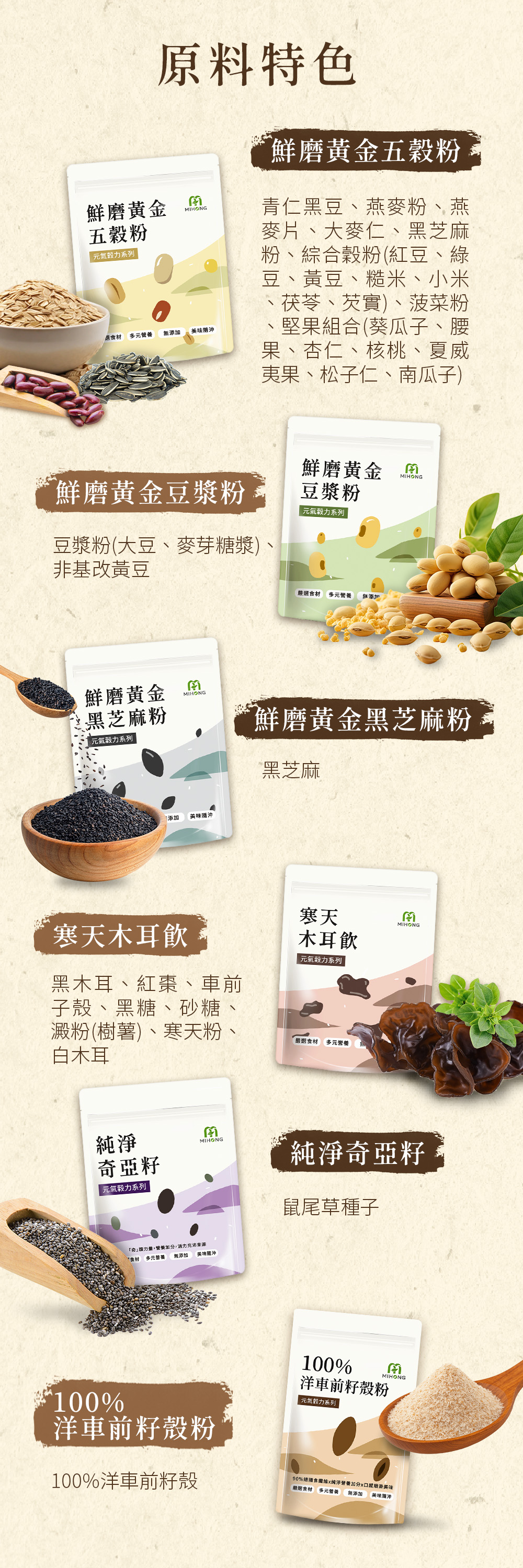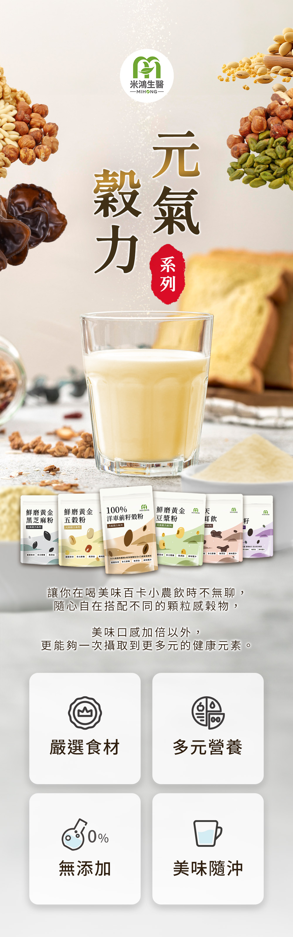 MIHONG®元氣穀力系列:主打嚴選食材、多元營養、無添加、美味隨沖,讓你在喝美味百卡小農飲時不無聊,能夠隨心自在搭配不同的顆粒感榖物,除了美味口感加倍以外,更能夠一次攝取到更多元的健康元素。