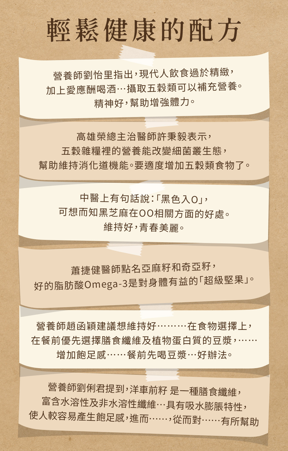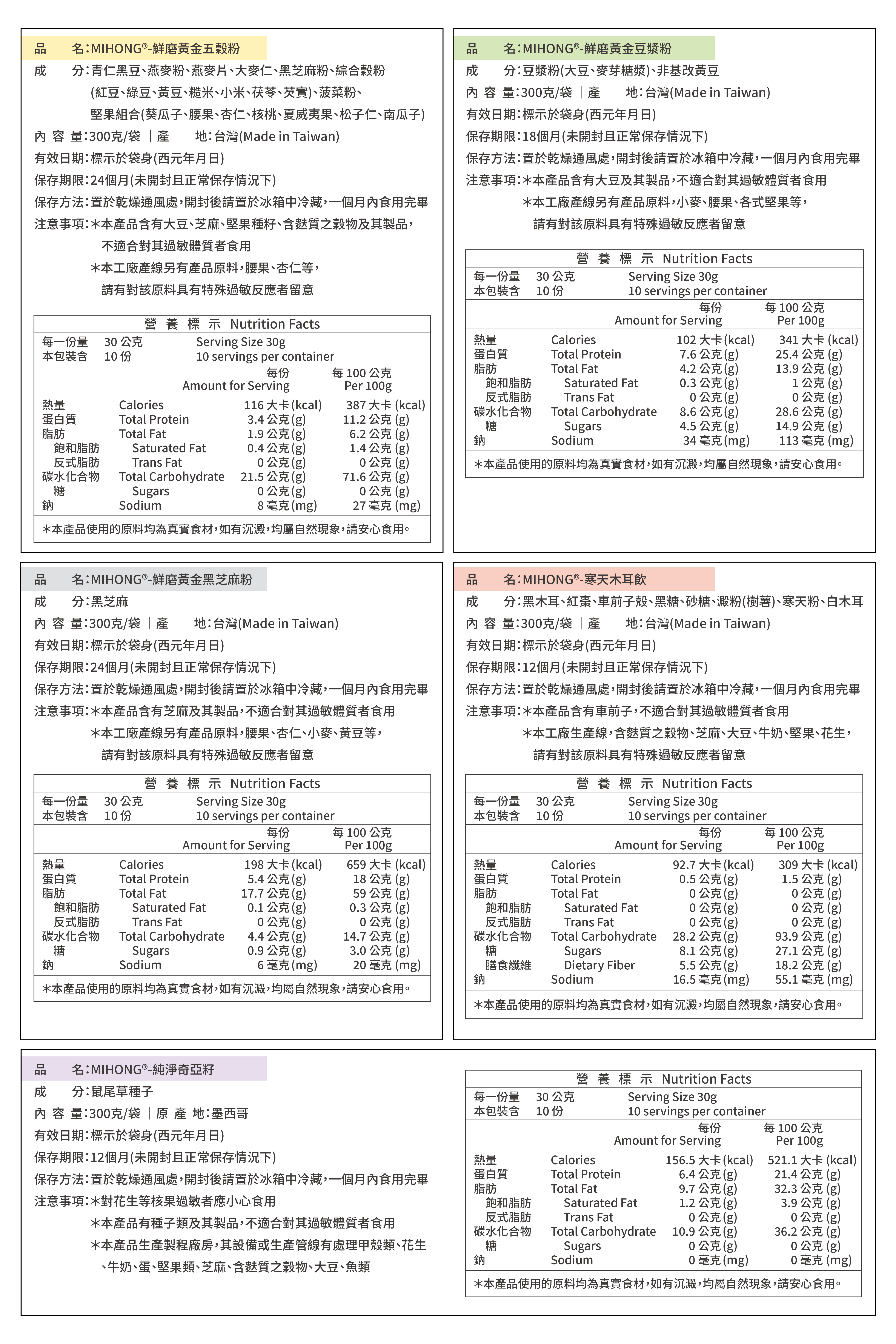 青仁黑豆、燕麥粉、燕麥片、大麥仁、黑芝麻粉、綜合穀粉(紅豆、綠豆、黃豆、糙米、小米、茯苓、芡實)、菠菜粉、堅果組合(葵瓜子、腰果、杏仁、核桃、夏威夷果、松子仁,南瓜子)