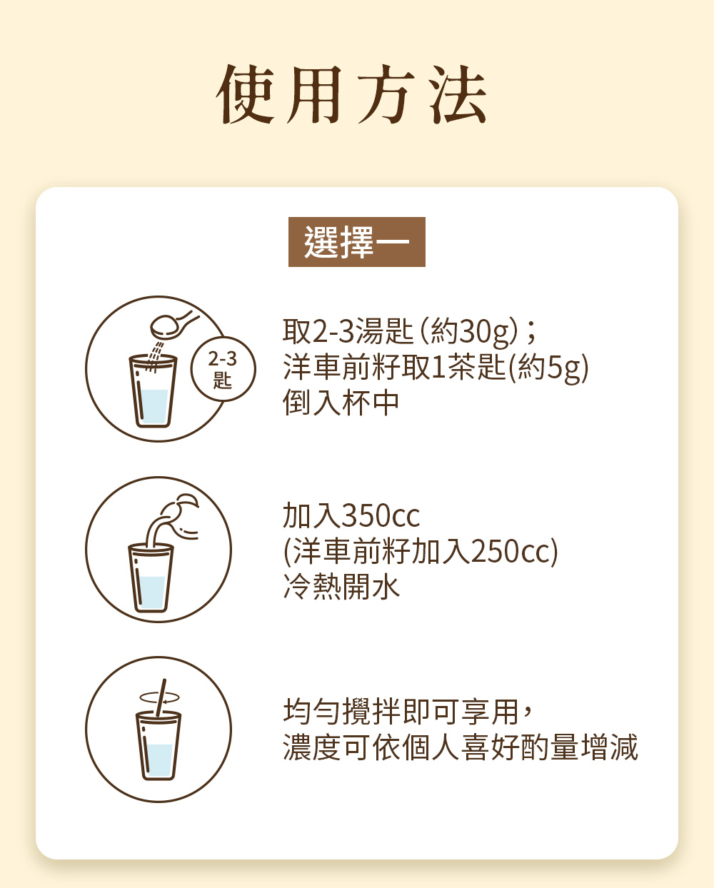 美味小秘方2: 因種籽膨脹係數極大,沖泡時建議水多粉少(熱水沖泡會更加膨脹!);建議邊沖泡邊攪拌,避免沾黏成塊狀;可使用在烘焙產品中,口感更加滑順!