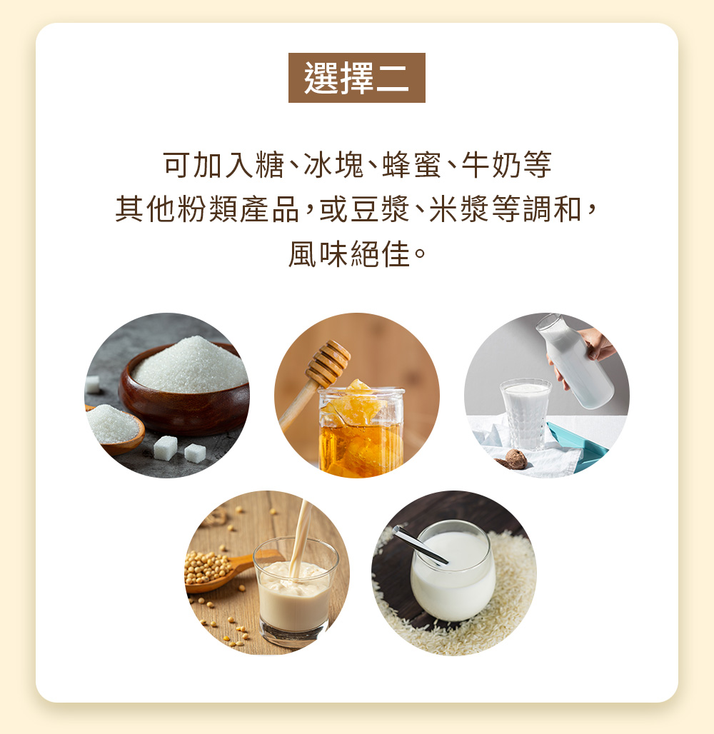 美味小秘方:亦可隨喜好添加燕麥片、果乾、小麥胚芽、黑芝麻等營養補充品飲用